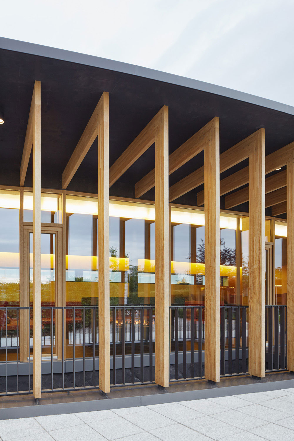 Pfosten-Riegel-Konstruktion Holz-Tragwerk aus lamelliertem Eichenholz Oberfläche geölt, Öffnungsflügel und Schiebeelemente sind in die Pfosten-Riegel-Konstruktion integriert.