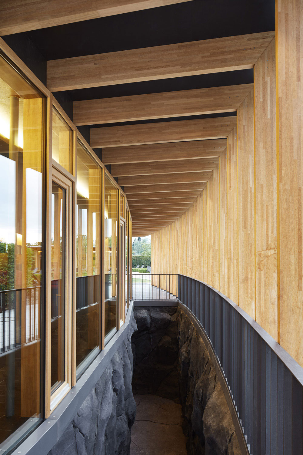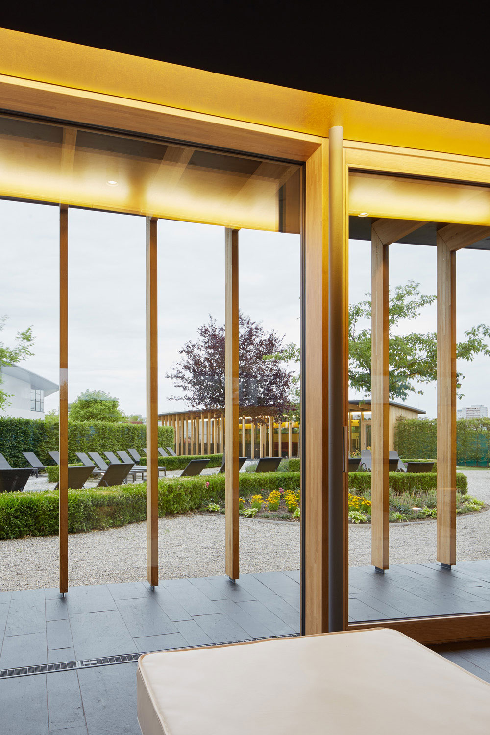 Dass ein Gebäude innerhalb einer Saunalandschaft als Holzbau konstruiert wird, stand für uns nicht in Frage. Es entstand ein Holzrahmenbau, der sich zum Garten hin skeletthaft auflöst. Durch die Krümmung der Gebäude und den vorgelagerten Arkadengang entsteht ein Zwischenraum, der nicht nur Sonne, sondern auch Blicke filtert. Trotz der Vollverglasung zum Garten fühlt man sich geborgen.