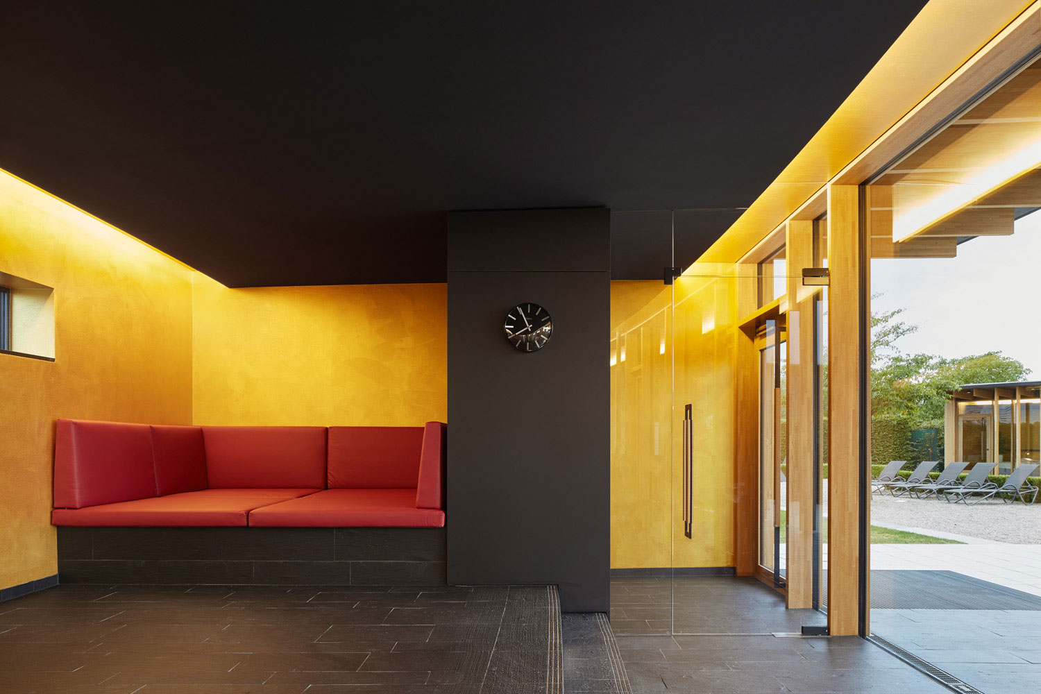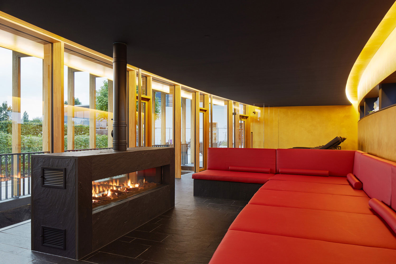 Im Innern sollte eine beruhigende und wertige Atmosphäre entstehen. Der Boden ist innen und außen mit schwarzem Naturschiefer belegt, die Decke wie der Nachthimmel mattschwarz gehalten. Der Glanz der golden beschichteten Wände wird über reflektierende Lichtvouten zusätzlich betont. Wasserbetten und eine Liegelandschaft mit samtrotem Lederbezug ergänzen die Erholungsmöglichkeiten.