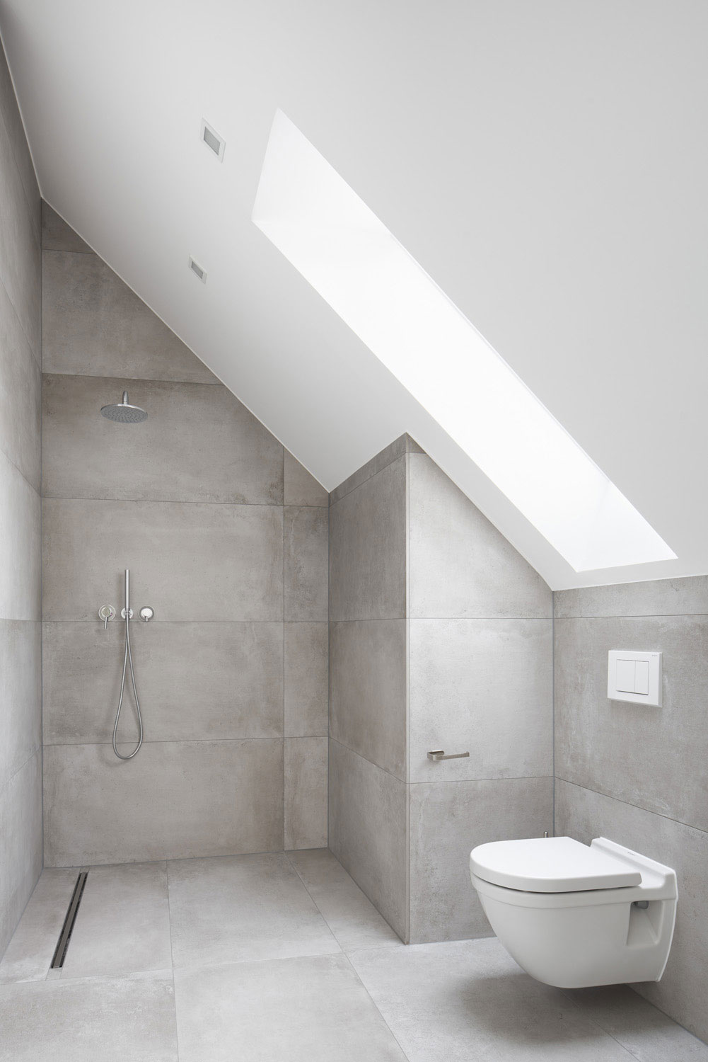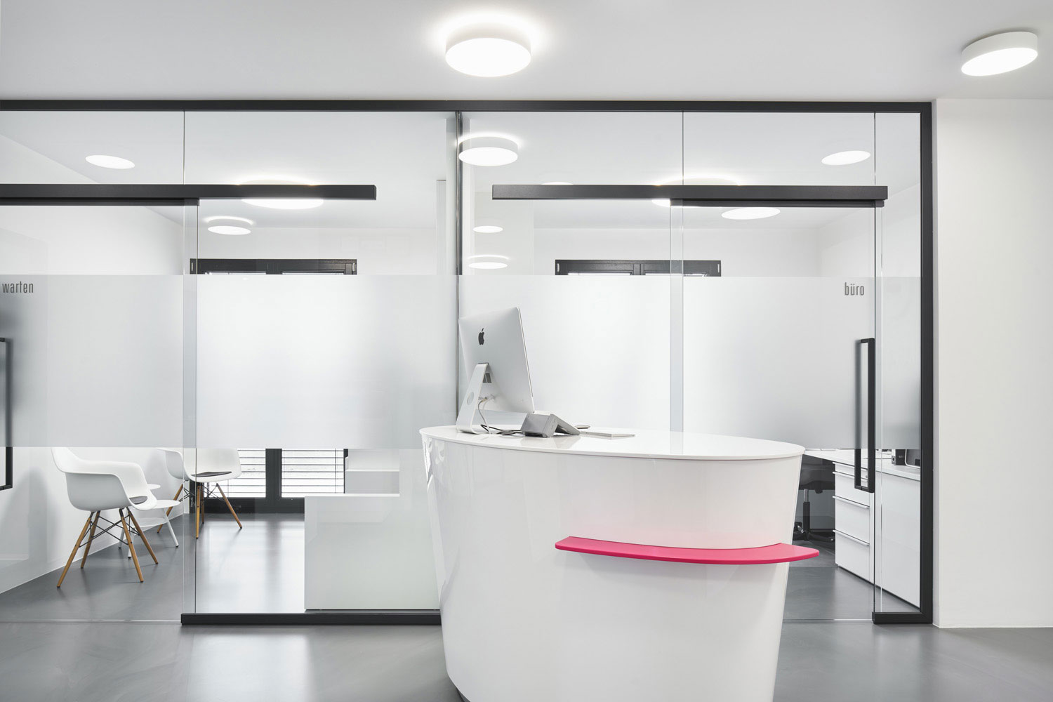 Das giebelständige Vorderhaus mit gereihten, stehenden Fensterformaten steht selbstbewusst zum Straßenraum. Die Volumensubtraktion am Gebäudeeck markiert den Eingang zur hochmodernen Praxis, die sich über alle Geschosse ausdehnt. Über den bestechend einfachen Treppenraum betritt man die Behandlungsräume. Diese wirken transparent, hell und dort durchlässig, wo es die Privatsphäre der Patienten nicht stört.