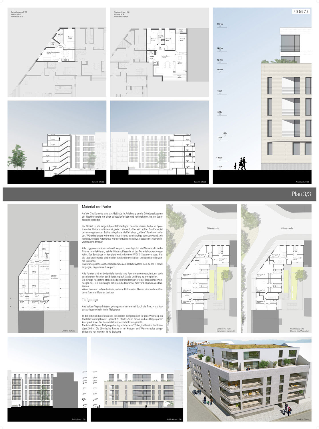 Der Sockel ist als eingefärbtes Betonfertigteil denkbar, dessen Farbe im Spektrum des Klinkers zu finden ist, jedoch etwas dunkler sein sollte. Das Farbspiel des unten genannten Steins spiegelt die Vielfalt eines "gelben" Sandsteins wieder. Wünschenswert wäre eine hinterlüftete, zweischalige Vormauerwand. Als kostengünstigere Alternative wäre eventuell eine WDVS-Fassade mit Riemchenverblendern denkbar.