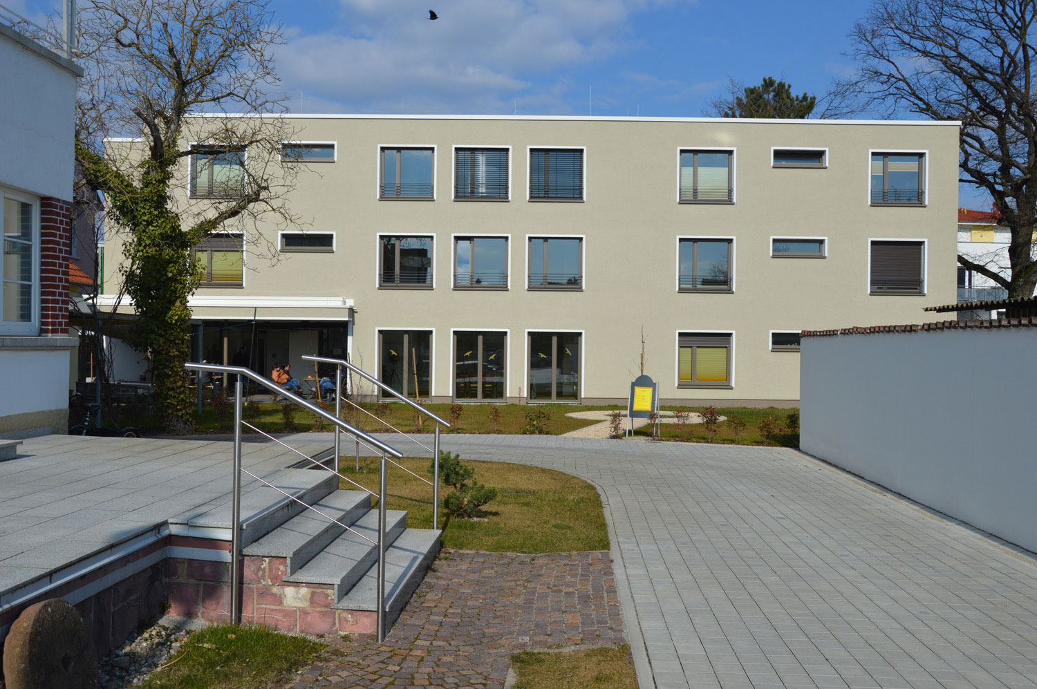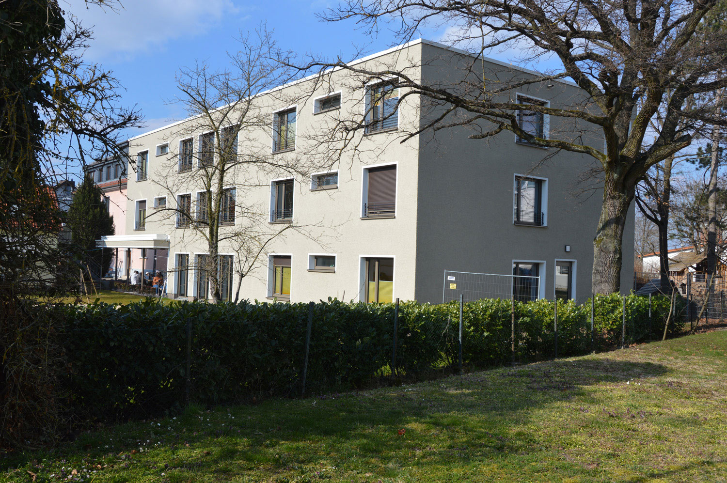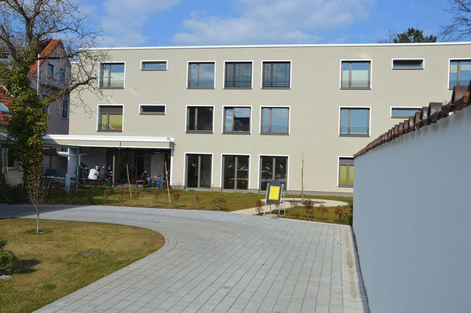 Wir haben hierfür ein dreigeschossiges Wohnheim mit 3 Wohngruppen mit jeweils 8 Ein- und Zweizimmer-Einheiten mit großzügigen Gemeinschaftsflächen auf dem bestehenden Standort, in zweiter Reihe, entworfen, geplant und gebaut. Jedes der 24 Bewohnerzimmer verfügt über ein Ensuite-Bad und eine hotelähnliche Ausstattung. Die Fenster sind mit einer niederen Brüstung errichtet, um den Bezug in den parkähnlichen Garten auch aus sitzender oder liegender Position zu ermöglichen. Selbstverständlich ist die gesamte Anlage barrierefrei ausgestattet.