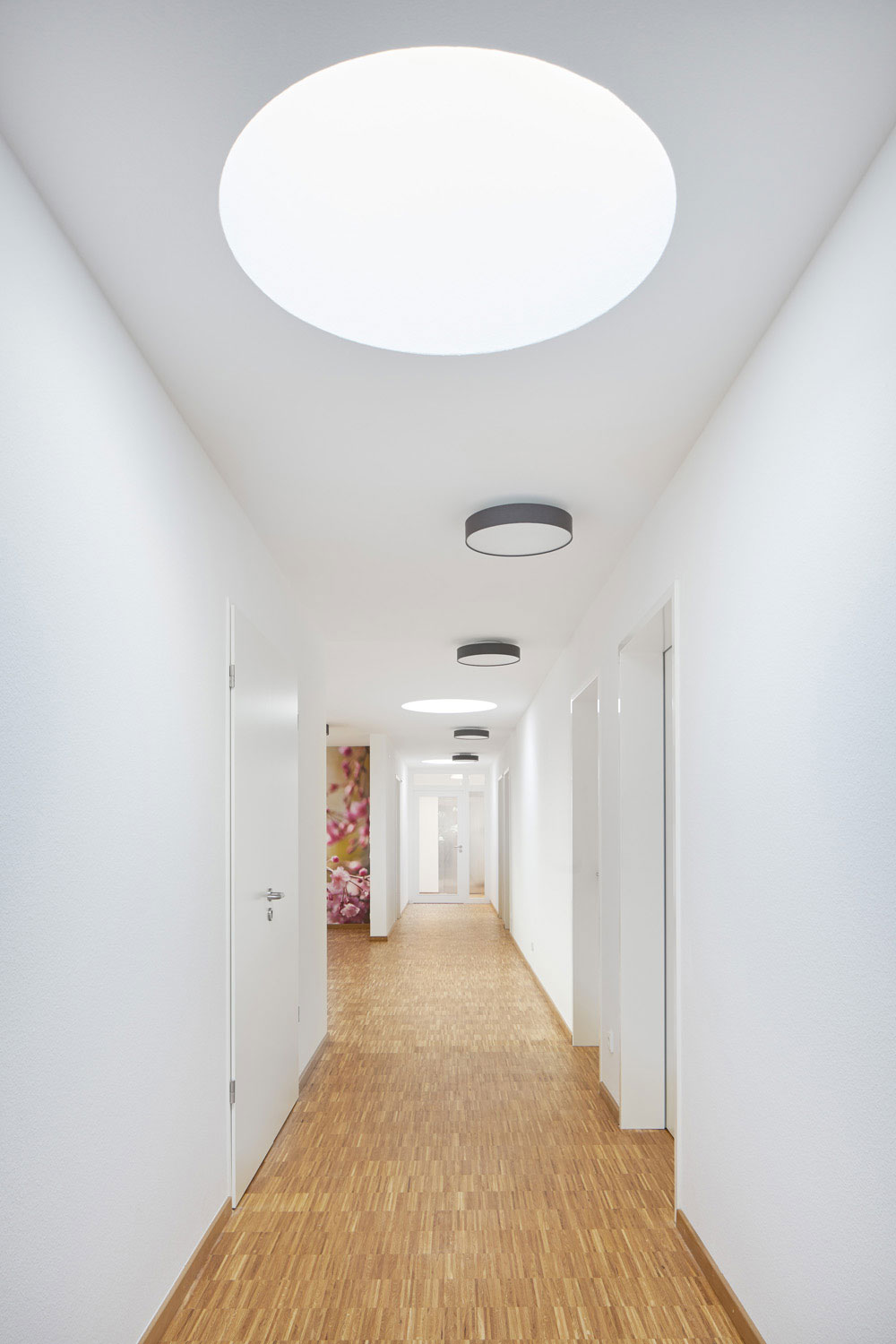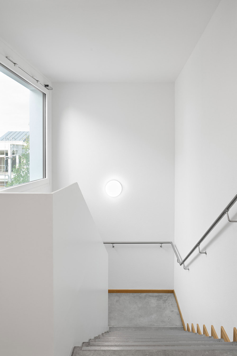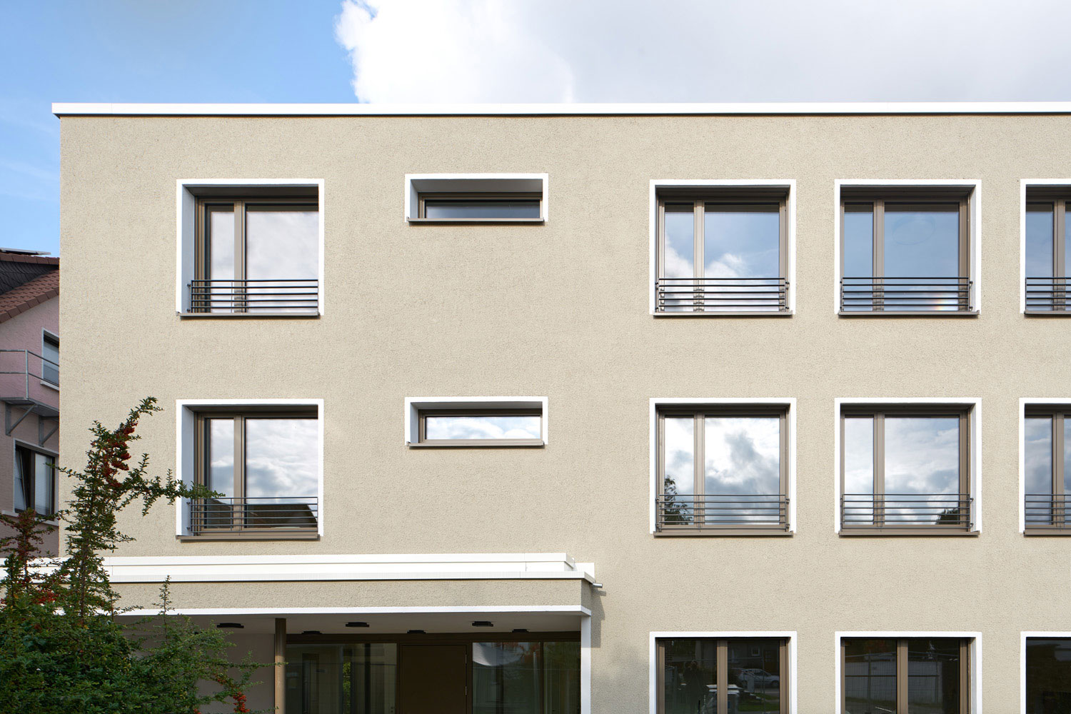 Wir haben hierfür ein dreigeschossiges Wohnheim mit 3 Wohngruppen mit jeweils 8 Ein- und Zweizimmer-Einheiten mit großzügigen Gemeinschaftsflächen auf dem bestehenden Standort, in zweiter Reihe, entworfen, geplant und gebaut. Jedes der 24 Bewohnerzimmer verfügt über ein Ensuite-Bad und eine hotelähnliche Ausstattung. Die Fenster sind mit einer niederen Brüstung errichtet, um den Bezug in den parkähnlichen Garten auch aus sitzender oder liegender Position zu ermöglichen. Selbstverständlich ist die gesamte Anlage barrierefrei ausgestattet.
