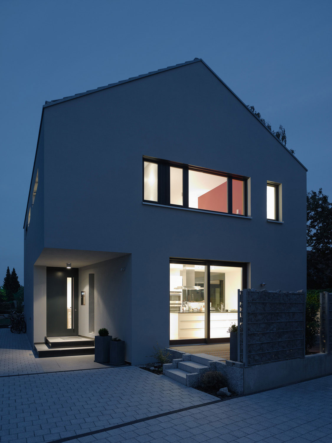 Es entstand ein an der Straße stehendes Haus mit Mietwohnungen und ein rückwärtiges Wohnhaus für die Familie des Bauherrn. Die notwendigen Stellplätze liegen dazwischen.