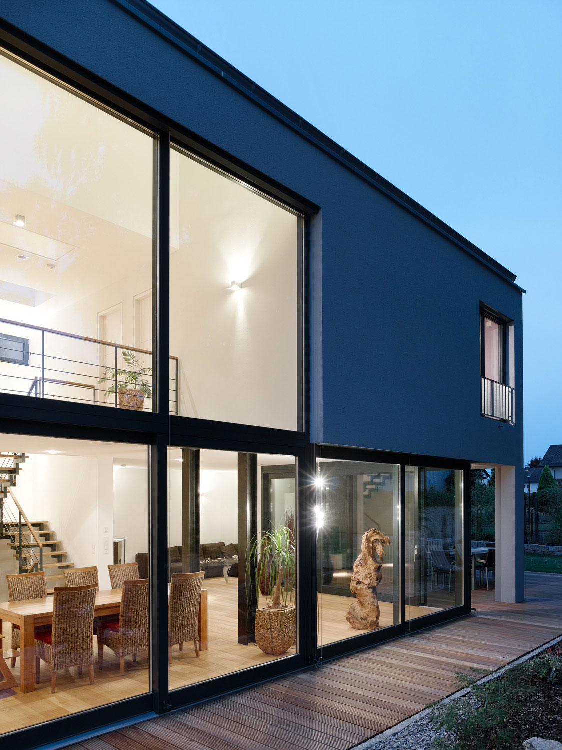 Geprägt durch den zweigeschossigen Luftraum mit Galerie über dem Essplatz, fließt der Grundriss von Kochen, Essen und Wohnen hoch in die Galerie. Die fast 6,00 m hohe Verglasung lässt das Sonnenlicht bis tief ins Innere des Gebäudes einfallen. Im Sommer schützt eine prächtige Birke vor zu viel Wärme, filtert das Licht und liefert nebenbei ein lebhaftes Schattenspiel auf Wänden und Böden.