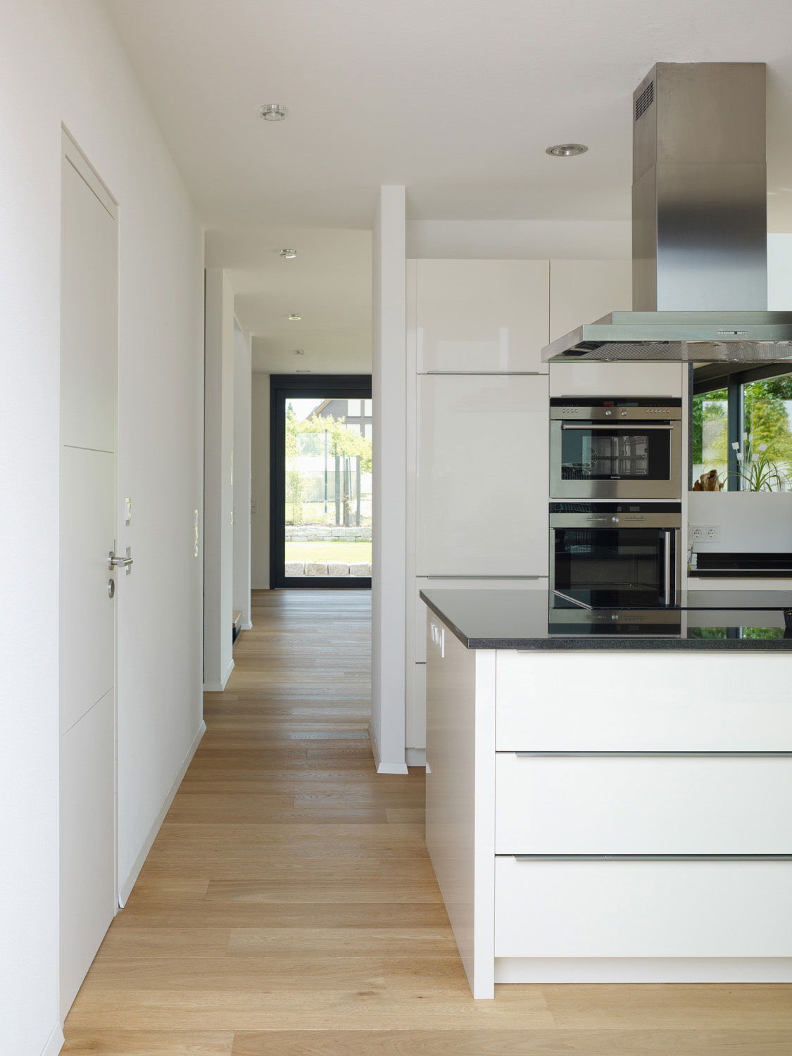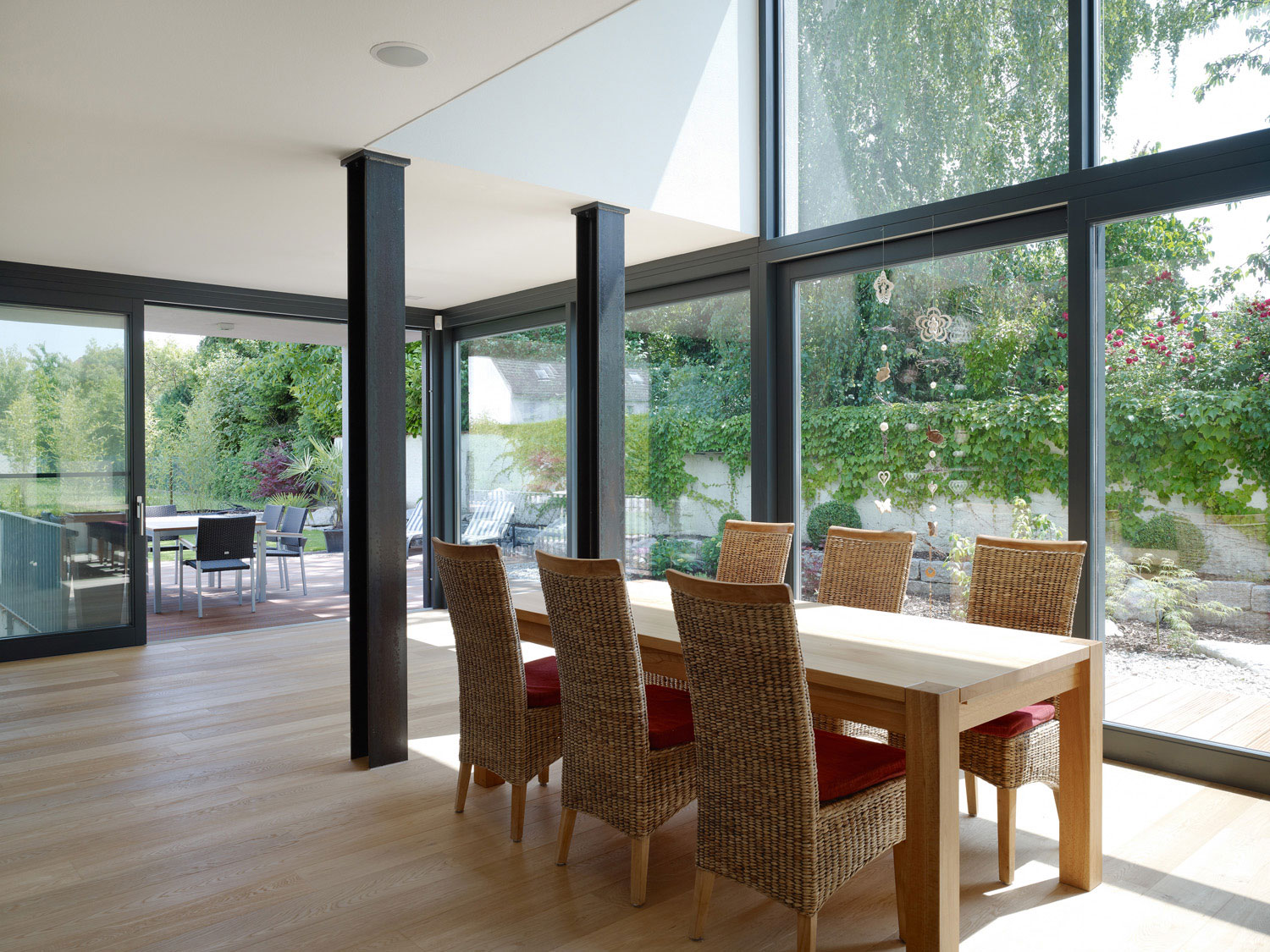 Das Rückgebäude wirkt kleiner, niederer, öffnet sich großzügig zum Garten, bietet aber reichlich Platz für die vierköpfige Familie. Innen und Außen gehen schwellenlos ineinander über.