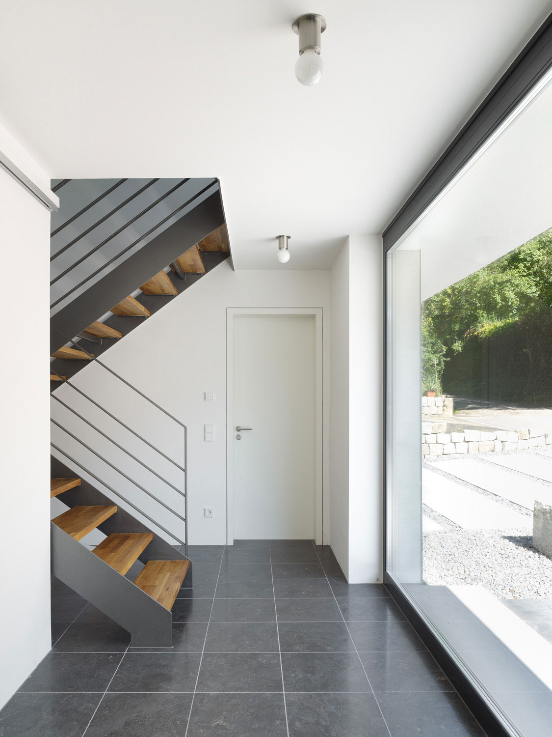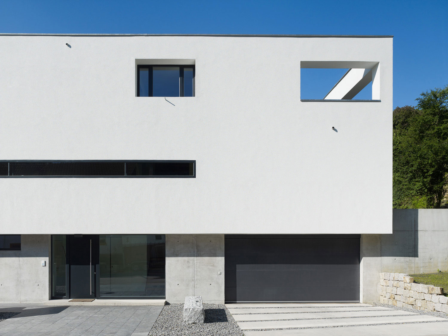 Der Sockel muss robust und widerstandsfähig gegen Erdreich und Feuchte sein, folgerichtig besteht er aus einer dicken Sichtbetonwand aus wärmedämmendem Leichtbeton. Der Überhang des darüber liegenden weißen, sauberen Hauses dient gleichtzeitig als Vordach am Haupteingang. Der Grundriss ist im Wohngeschoss offen und mit fließendem Übergang zum Garten.