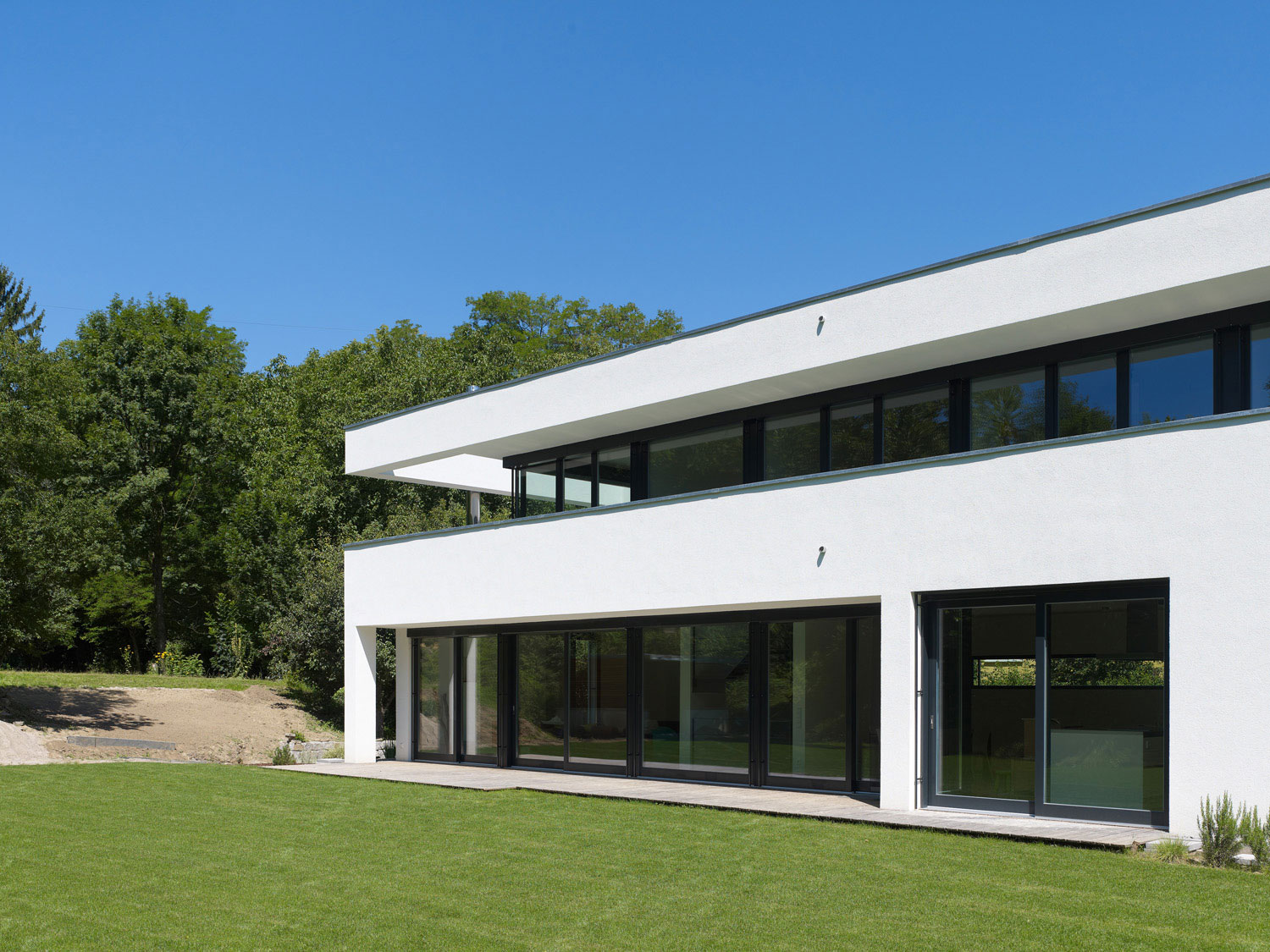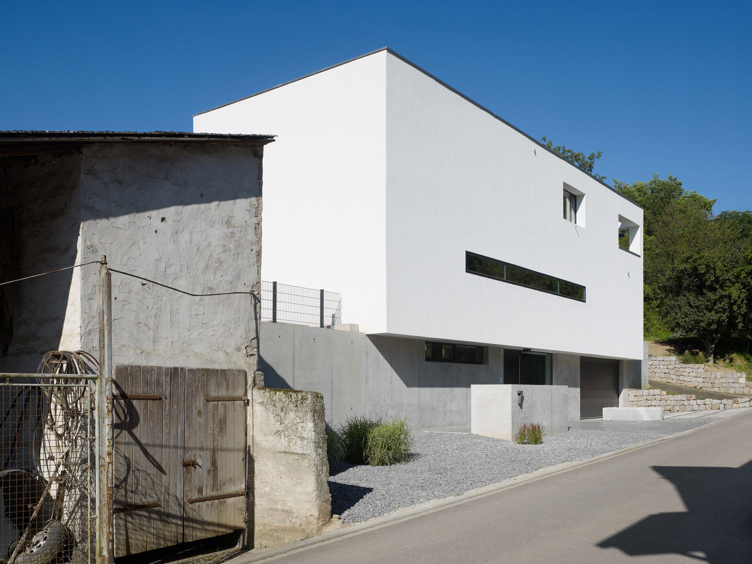 Durch den glücklichen Umstand des fehlenden Bebauungsplans war unsere Auflage gemäß § 34 Bau GB die Einbindung in die Umgebung. Entsprechend verfuhren wir mit der Anordnung des Baukörpers in Straßenflucht und der Geschossigkeit gemäß den Nachbarhäusern. Die moderne, klare Formensprache mit scharf geschnittenen Kanten fand Zustimmung bei Gemeinde und Bauverwaltung.