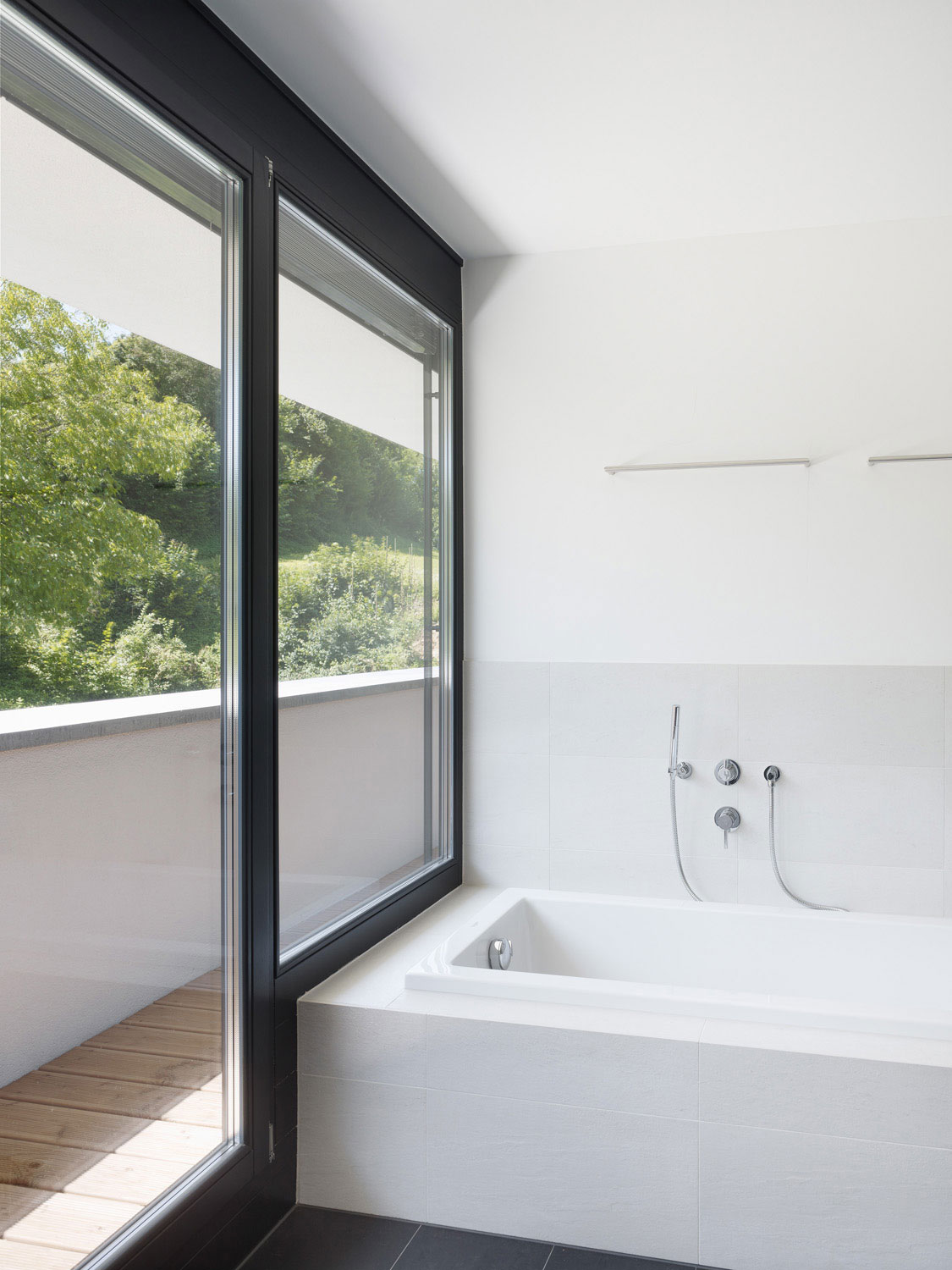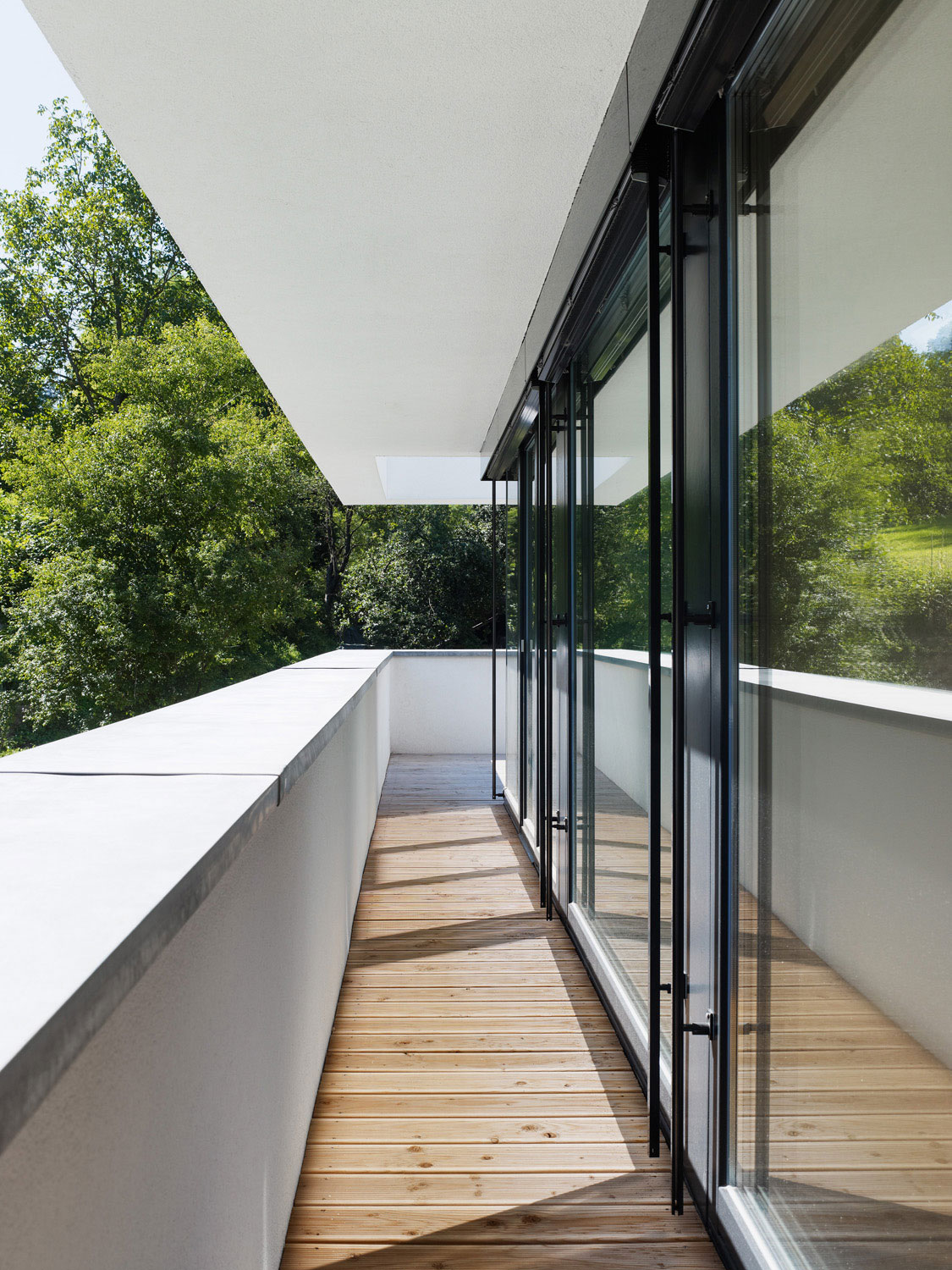 Der erste Geländebruch wird durch eine geschosshohe Sockelzone abgefangen, in der dienende Räume mit untergeordneten Funktionen untergebracht sind. Darüber auf Gartenniveau befinden sich die Wohnräume. Im Obergeschoss mit Dachterrasse vor jedem Raum und schönem Blick durch die Baumkronen zum Horizont liegen die Individualräume.