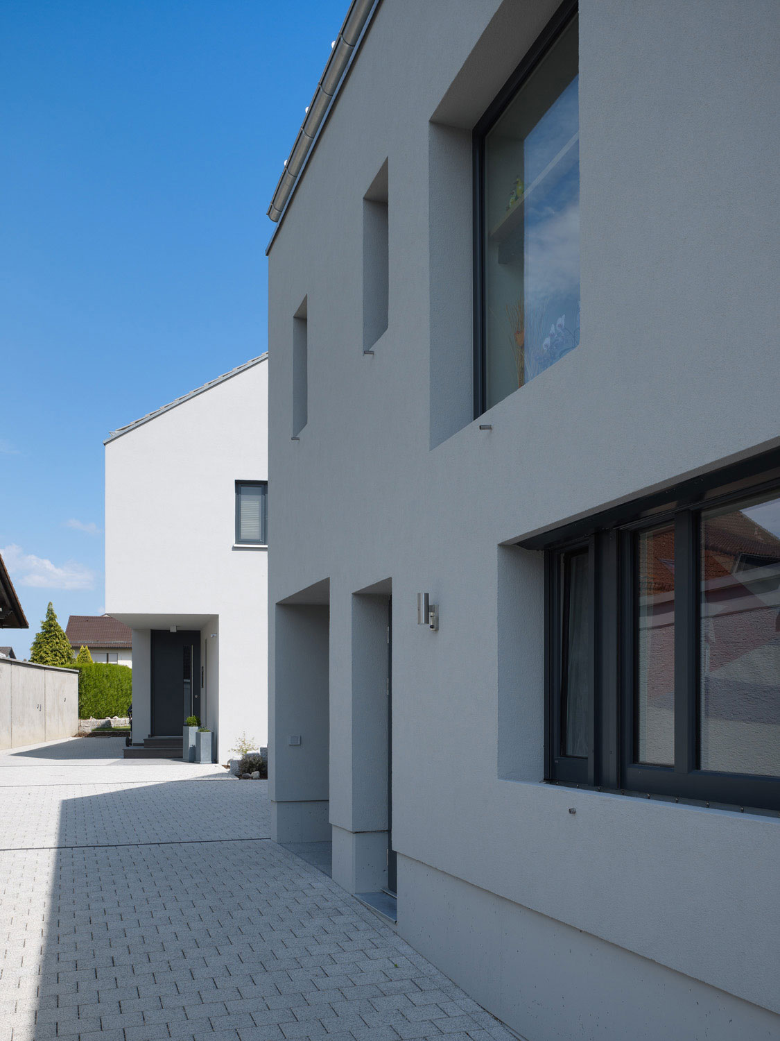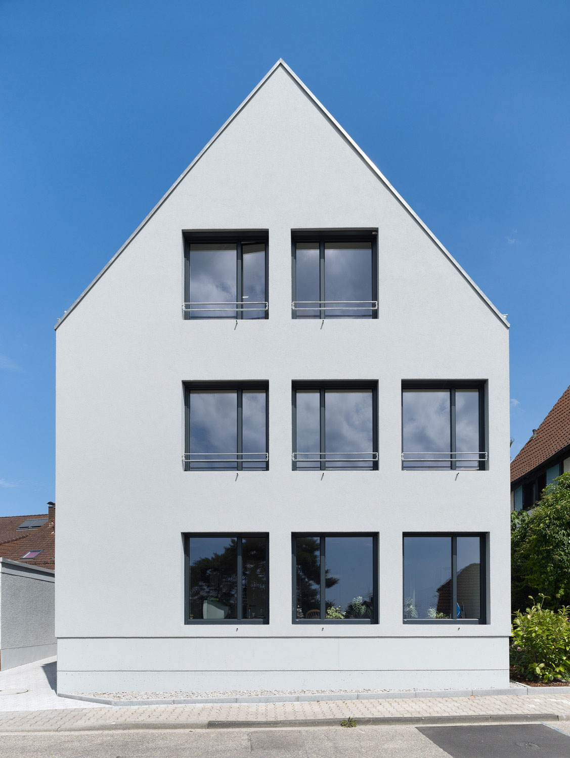 Auf dem schmalen, langen Grundstück im Ortskern von Rheinstetten stand ein sanierungsbedürftiger Altbau. Der Bebauungsplan ließ ein Vorder- und ein Rückgebäude zu, jedoch mit der Auflage, dass das Vorderhaus genau an der gleichen Stelle stehen musste wie der zum Abriss freigegebene Altbau.
