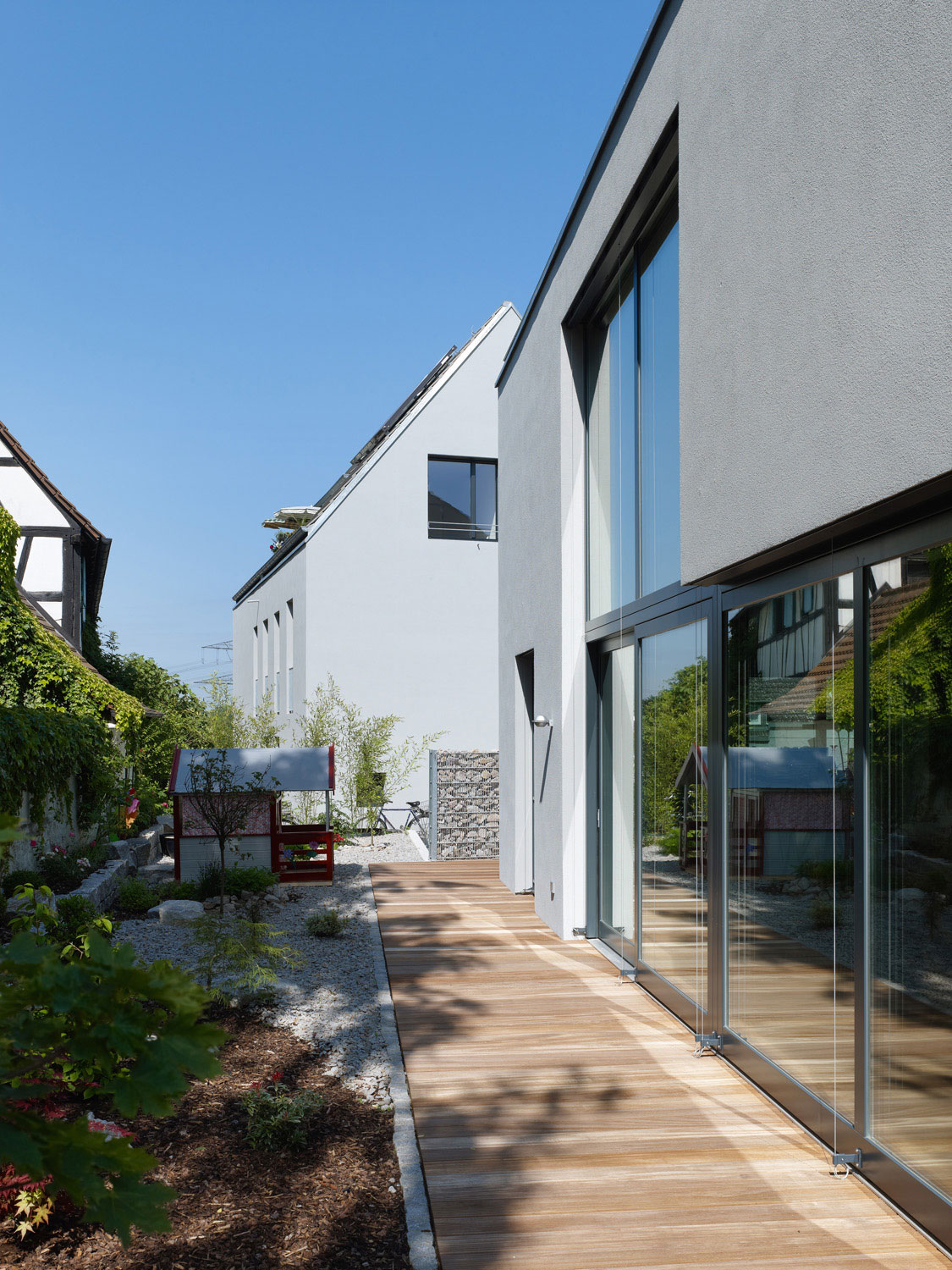 Das Rückgebäude wirkt kleiner, niederer, öffnet sich großzügig zum Garten, bietet aber reichlich Platz für die vierköpfige Familie. Innen und Außen gehen schwellenlos ineinander über.