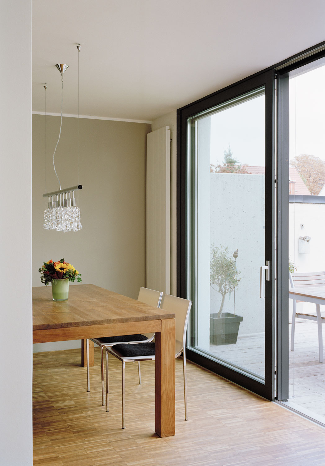 Beim Umbau mussten einige Innenwände weichen, um die Kleinteiligkeit aufzubrechen. Die Fenster zur Straße wurden bodentief, der Anbau zeitgemäß mit großen Fensterflächen zur Terrasse hin geöffnet. Die alte Holztreppe blieb erhalten, zur Bühne kam eine elegant gefaltete Stahltreppe hinzu. Das massive und sehr robuste Eiche-Industrieparkett wurde in allen Geschossen neu verlegt und zieht alle Flächen zusammen, der Grundriss fließt.
