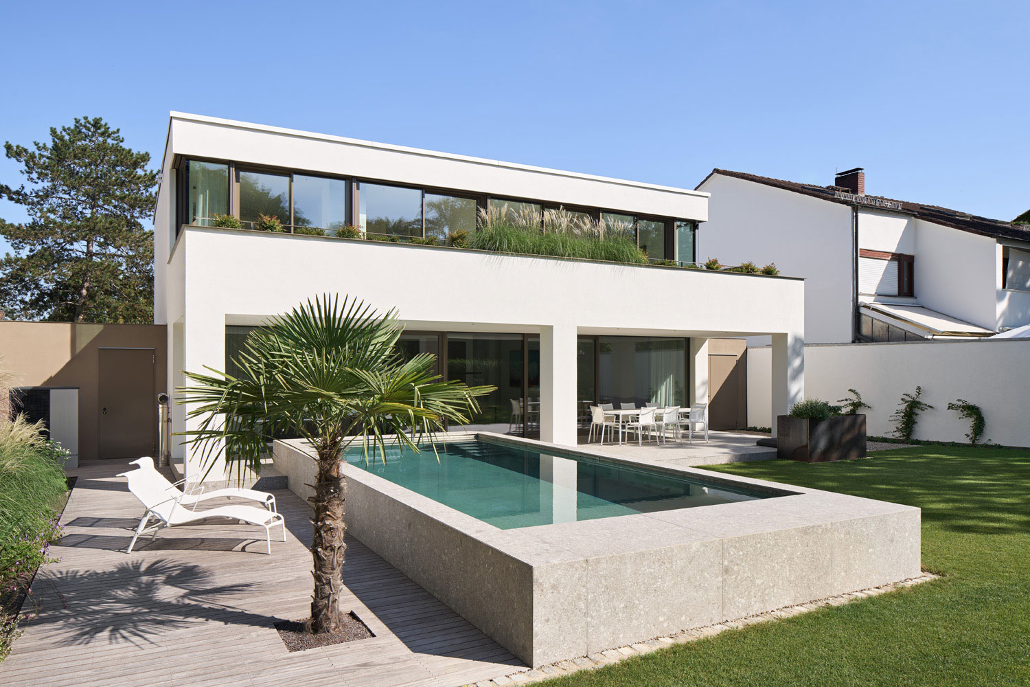 Energetisch für die Zukunft gut aufgestellt, aber angemessen, das war die Vorgabe unserer Bauherren. Wärme wird über eine effiziente Wärmepumpe erzeugt. Strom wird über die flach auf dem Dach aufliegende PV-Anlage erzeugt und an Ort und Stelle verbraucht, überschüssige Energie im Batteriespeicher eingelagert und zeitversetzt selbst verbraucht bzw. ins Netz eingespeist. Die Ladestation für E-Mobilität steht bereit. Auch die Beheizung des Pools erfolgt regenerativ über eine externe Wärmepumpe. Die hochgedämmte Gebäudehülle mit den Hochleistungsverglasungen sorgt für minimalen Transmissionswärmeverlust.