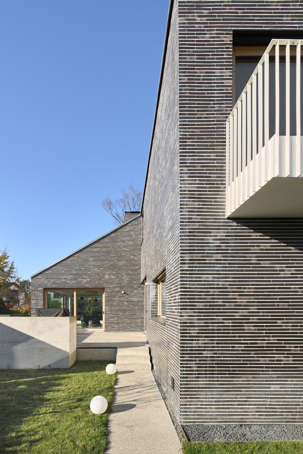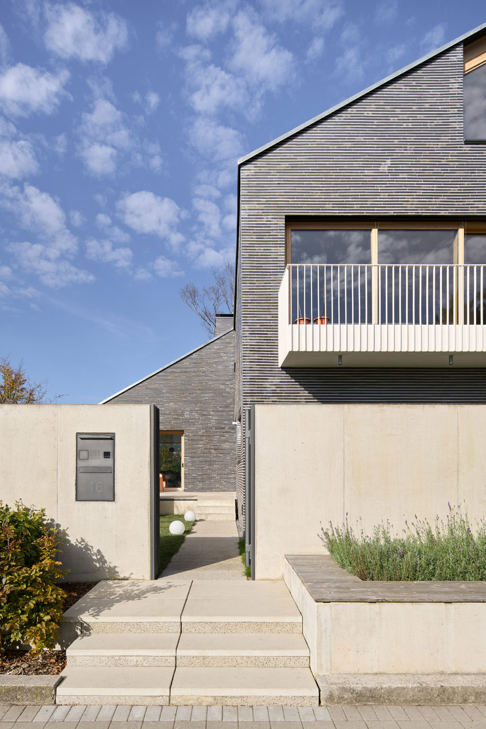 Die Fassade wurde ganz besonders gestaltet. Es wurde eine schwarze Klinkeroberfläche im Langformat errichtet, wobei die Lagerfugen weiß und die Stoßfugen schwarz verfugt wurden. Somit entstanden nur horizontale, helle Linien, was dem Gebäude eine besondere Eleganz verschafft. Diese Klinkerfassade wurde mit geölten Fenstern aus Eichenholz veredelt. Das geneigte Dach verblieb in seiner Satteldachform, wurde jedoch technisch und gestalterisch optimiert. Innenliegende Regenrinnen und Fallrohre, Dachränder aus Metall lassen den Baukörper klar, scharfkantig und modern wirken, ohne den Charakter eines Hauses aus den 60ern zu verstecken.