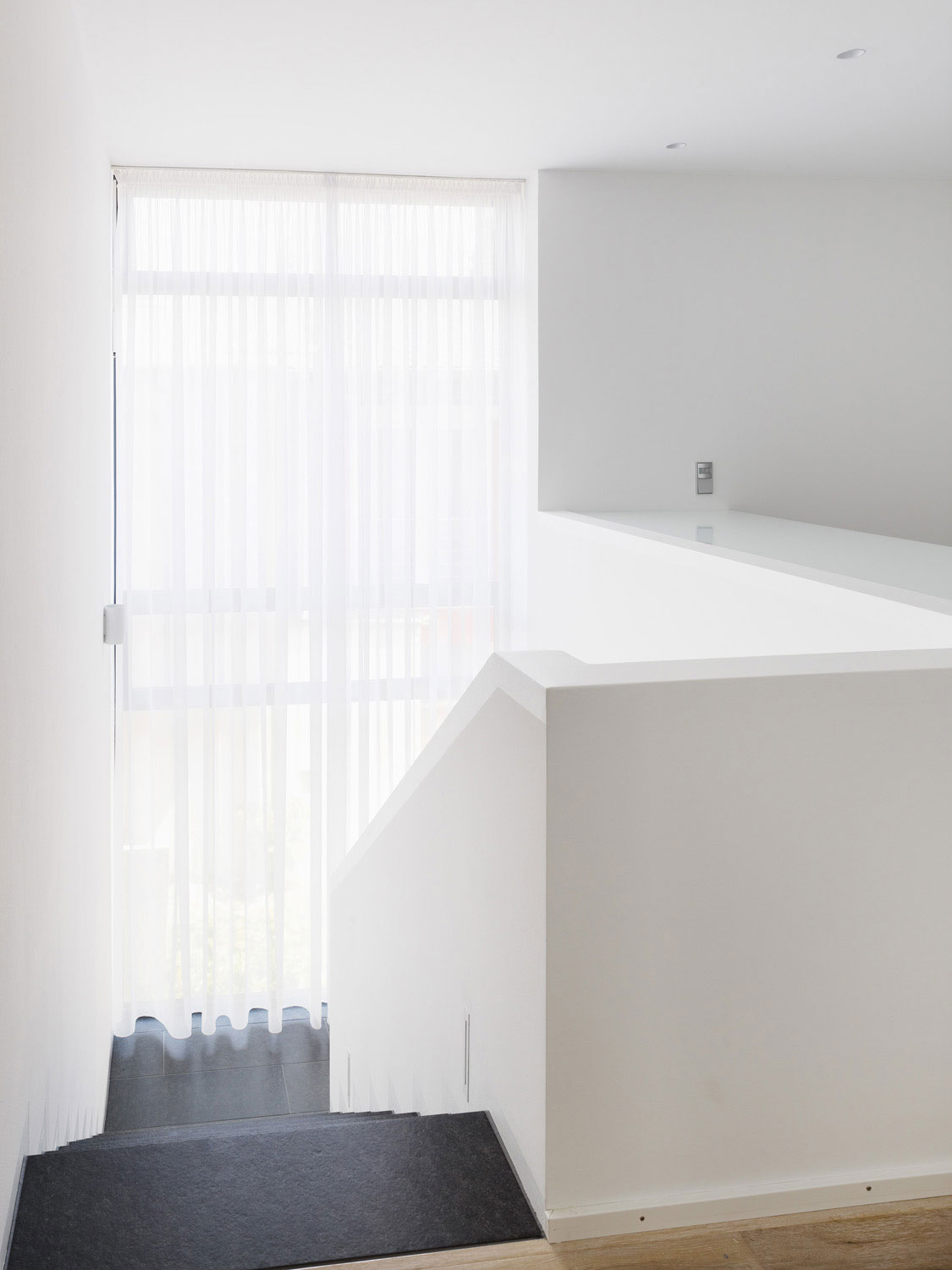 Nach ersten Entwurfszeichnungen entschied sich der Bauherr dazu, ein Geschoss aufzustocken, was den Entwurf entscheidend veränderte. Die Rolle der Geschosstreppe wandelte sich vom bloßen Kellerabgang zur begehbaren Skulptur. Die bis dahin noch stehengebliebenen Wände im Erdgeschoss wurden in diesem Zuge bis zur Kellerdecke abgetragen und neu aufgebaut.