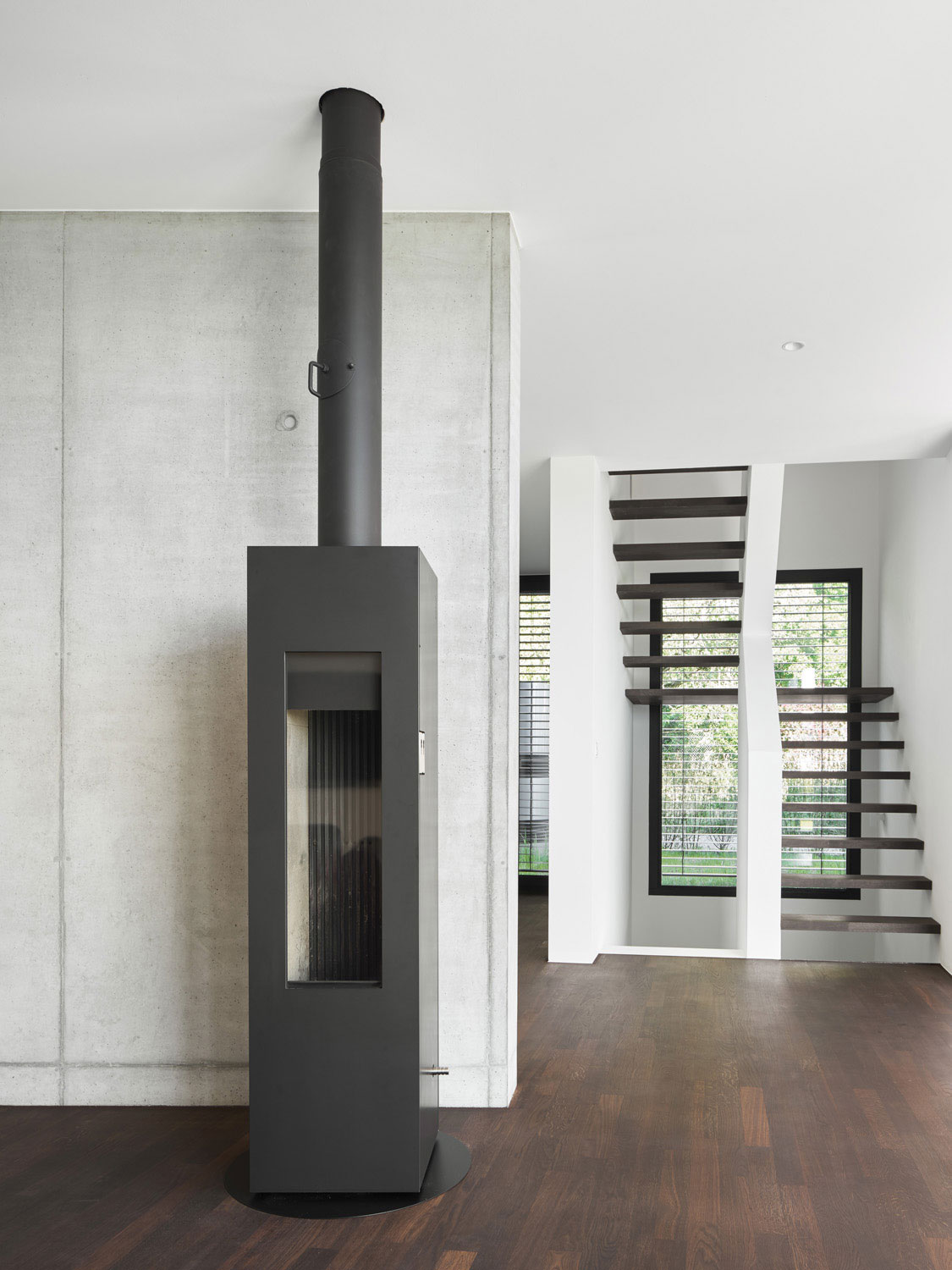 Im Innern sind die Räume von erfrischender Klarheit geprägt. Von jedem Standort eröffnen sich Durch- und Ausblicke, Sonnenlicht ist allgegenwärtig. Die Materialien nehmen sich freundlich zurück, ein dunkler Holzboden zieht alle Räume zu einem Großen zusammen. Perfekt ausgeführte Sichtbeton-Bauteile wirken vor den sonstigen weißen und schwarzen Putzflächen wie edle Natursteinwände. Die nicht sichtbar befestigten Treppenstufen zwischen den weißen Wänden vermitteln größtmögliche Transparenz. Stoffe als Sicht- und Verdunkelungsschutz in den Schlafräumen unterstützen diese Leichtigkeit.