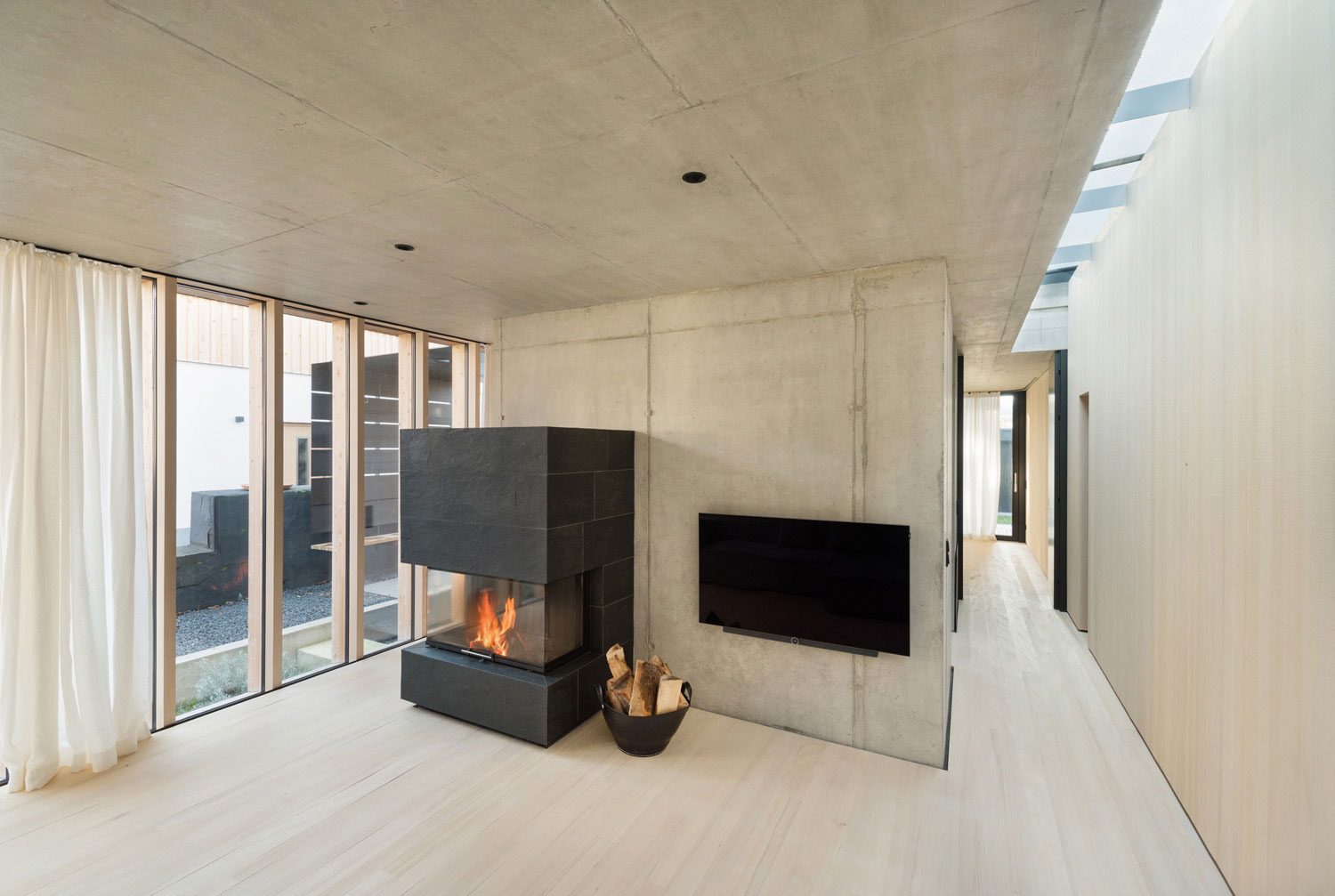 Alle Bauteile und Oberflächen sind so angelegt, dass der Raumeindruck nicht begrenzt wird. Alle Öffnungen sind raumhoch, die Sichtbetondecke läuft durch und will kein Ende finden. Die geschlossene Nordwand ist mit sägerauer Weißtanne ganzflächig vertäfelt. Die Vertäfelung läuft bis zur rahmenlosen Oberlichtverglasung hoch. Streiflicht fällt über die haptische Holzoberfläche hinab.