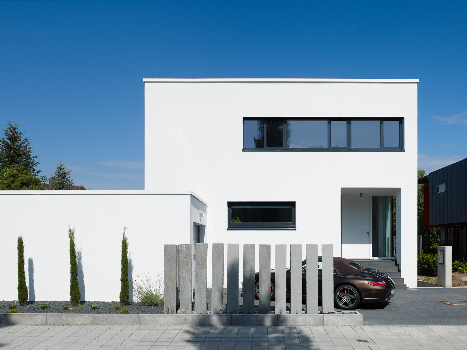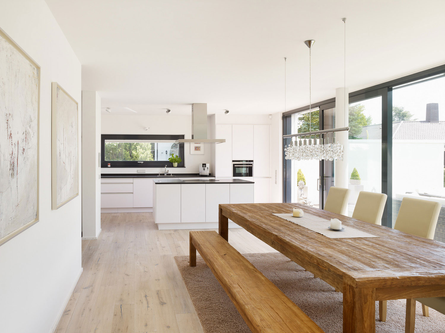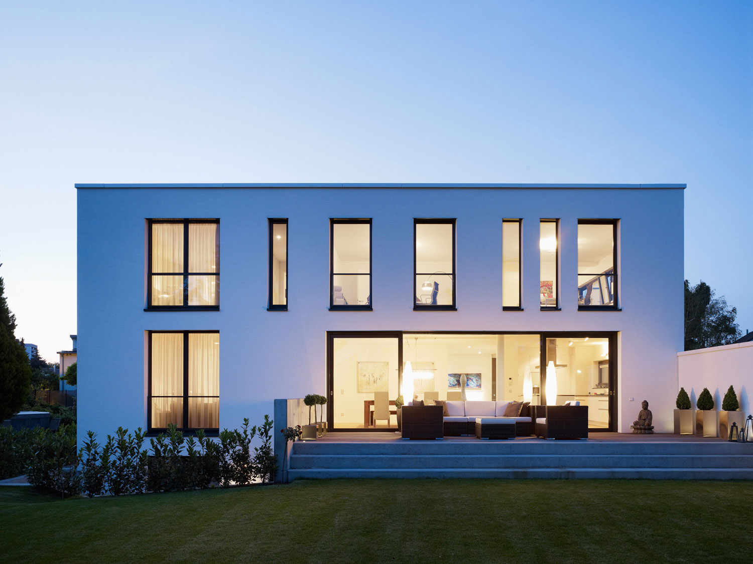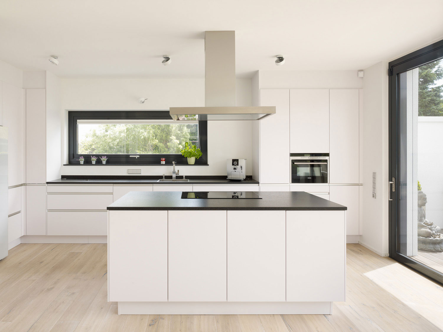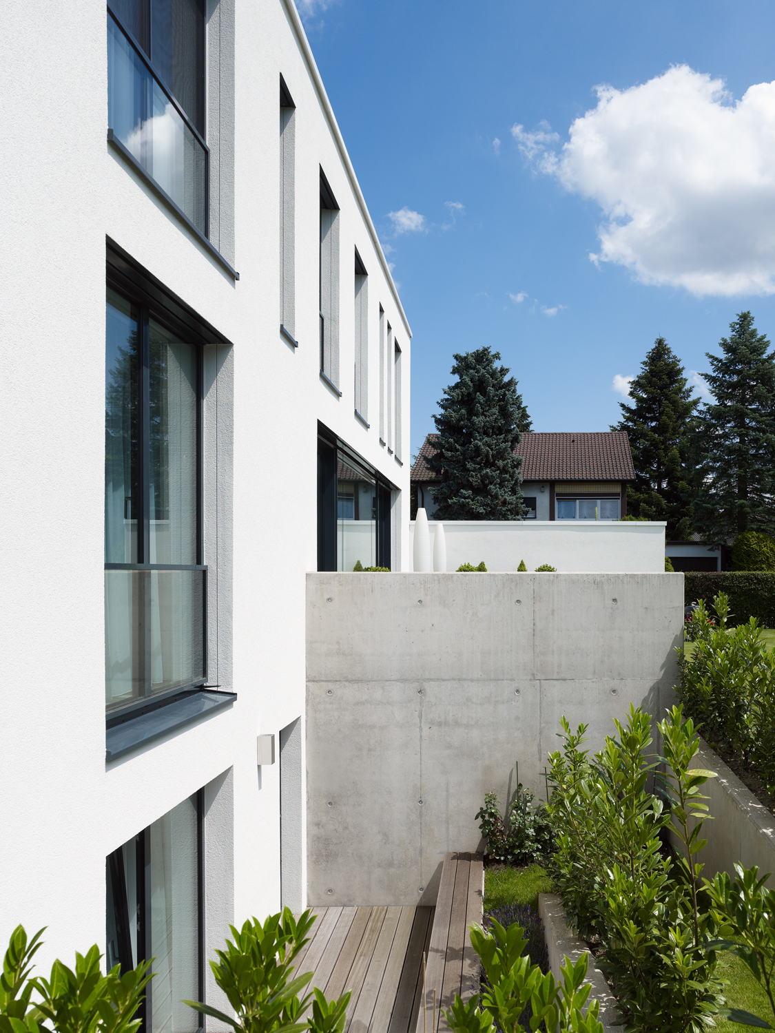 Im Erdgeschoss finden sich die Bereiche Kochen, Essen und Wohnen mit Bibliothek. Die Küche hat Kontakt zur Straße und zum Hauseingang. Der Koch-Essbereich öffnet sich großzügig zu der ausladenden Südterrasse. Über eine breite Stufenanlage kommt man in den Garten mit altem Nussbaum. Glücklicherweise konnte die dicht gewachsene Hecke und weitere groß gewachsene Pflanzen und Bäume erhalten werden, so dass der Garten mit geringem Aufwand kurz nach dem Einzug präsent war.