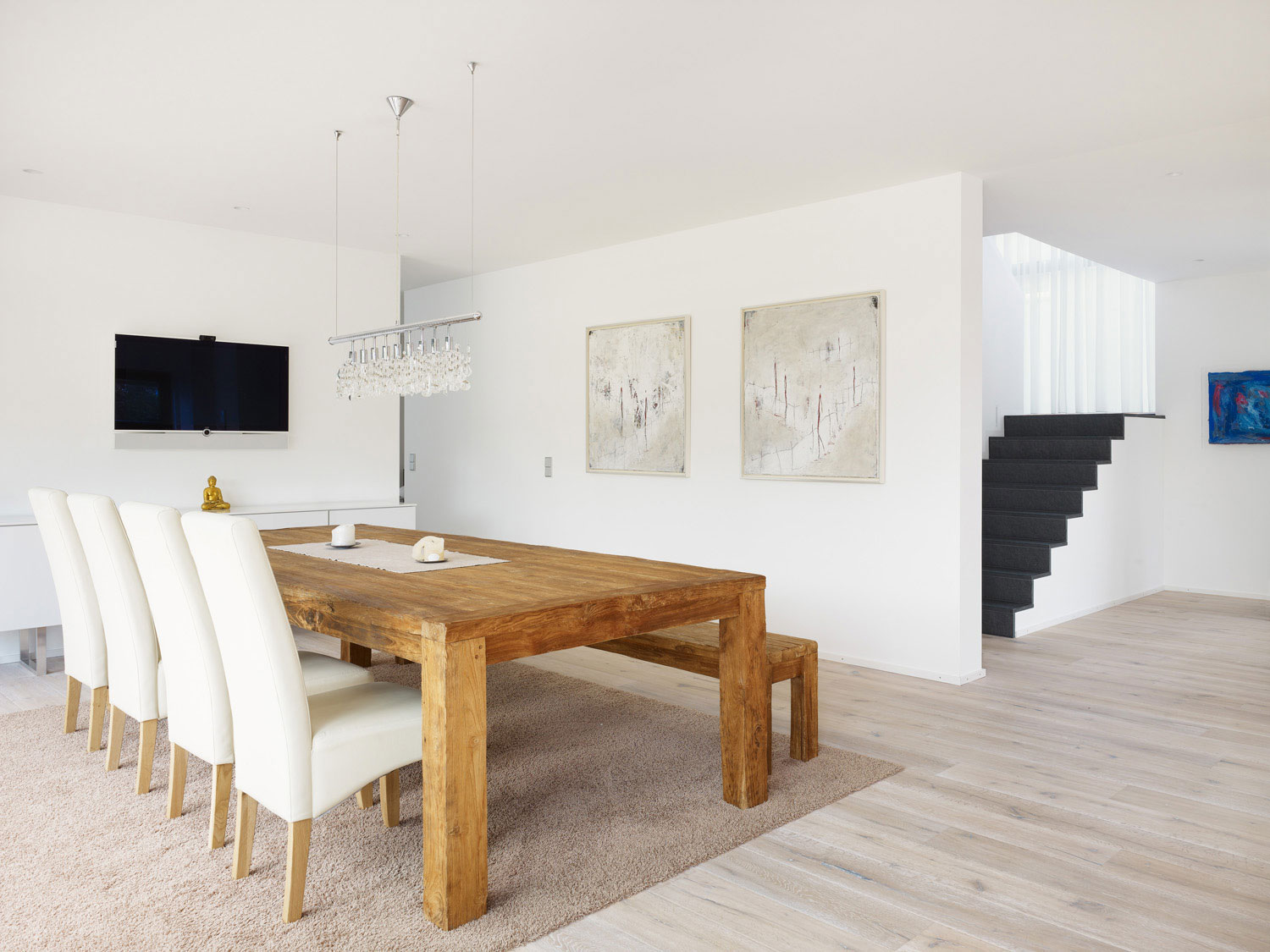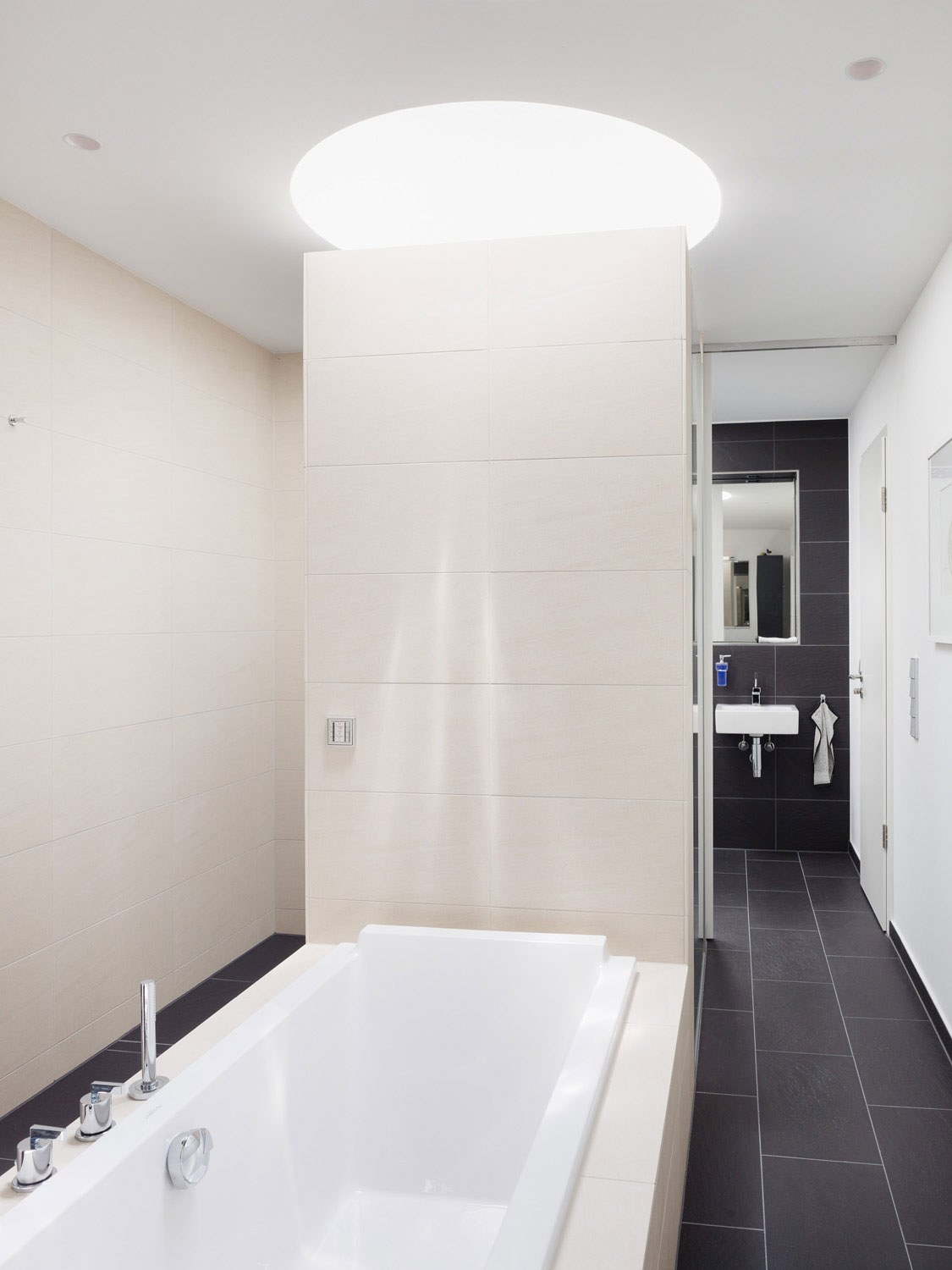 Über die offene Treppe kommt man ins Obergeschoss mit den Arbeits- und Schlafräumen und den Badezimmern. Die große Lichtkuppel über der Badewanne bzw. Dusche ermöglicht den direkten Blick in den Himmel.