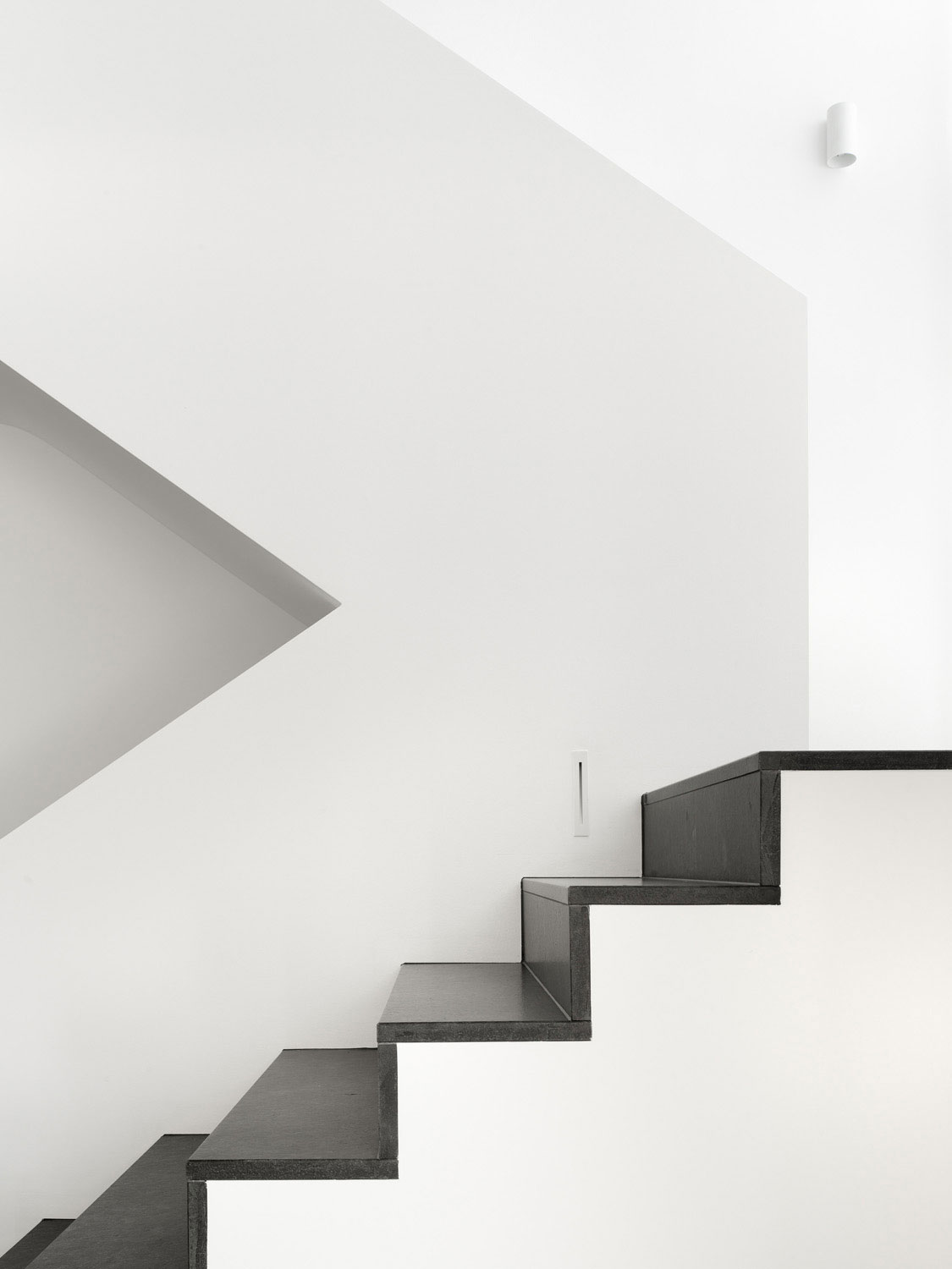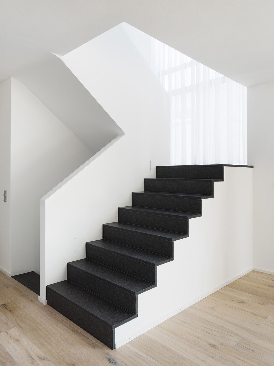 Nach ersten Entwurfszeichnungen entschied sich der Bauherr dazu, ein Geschoss aufzustocken, was den Entwurf entscheidend veränderte. Die Rolle der Geschosstreppe wandelte sich vom bloßen Kellerabgang zur begehbaren Skulptur. Die bis dahin noch stehengebliebenen Wände im Erdgeschoss wurden in diesem Zuge bis zur Kellerdecke abgetragen und neu aufgebaut.