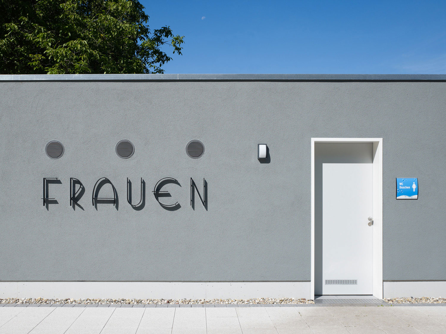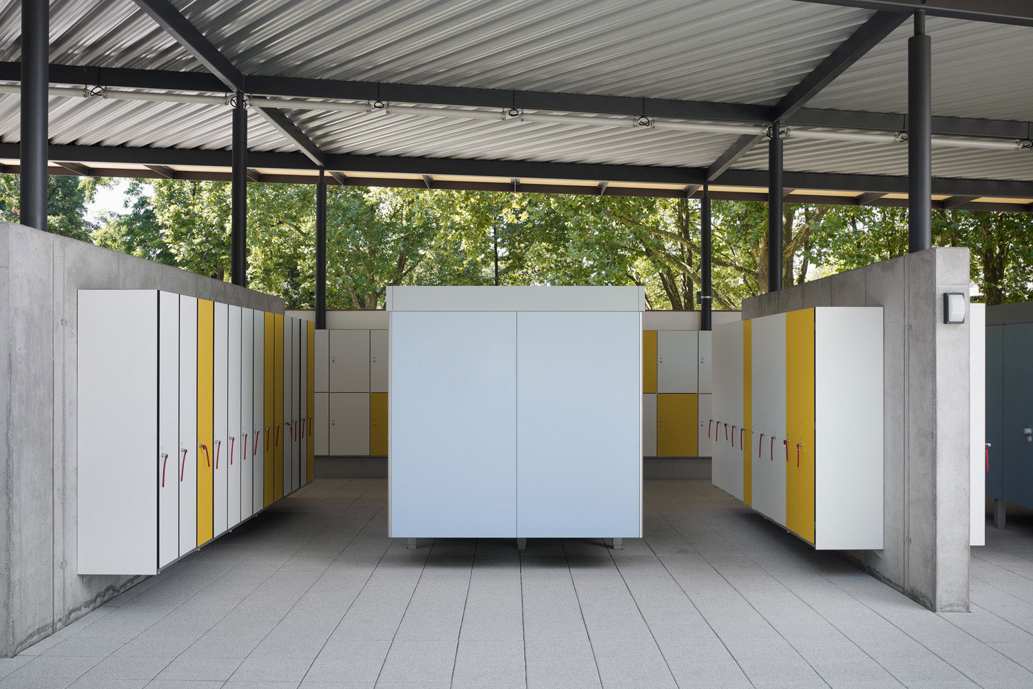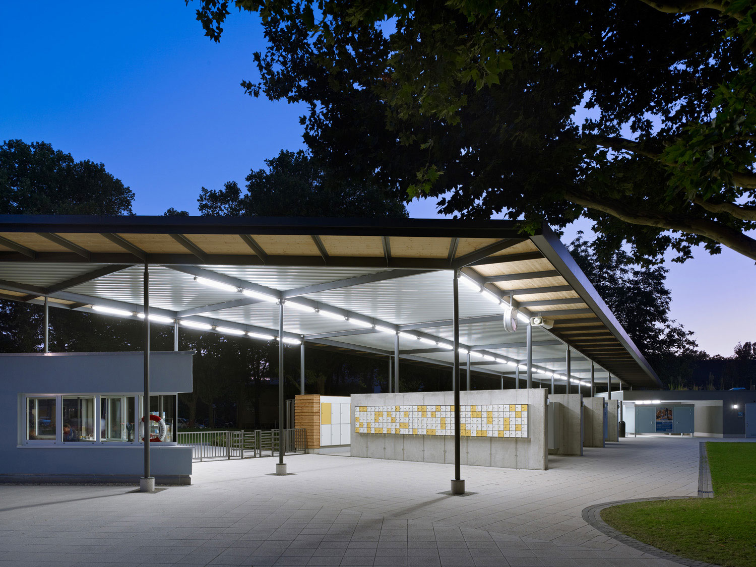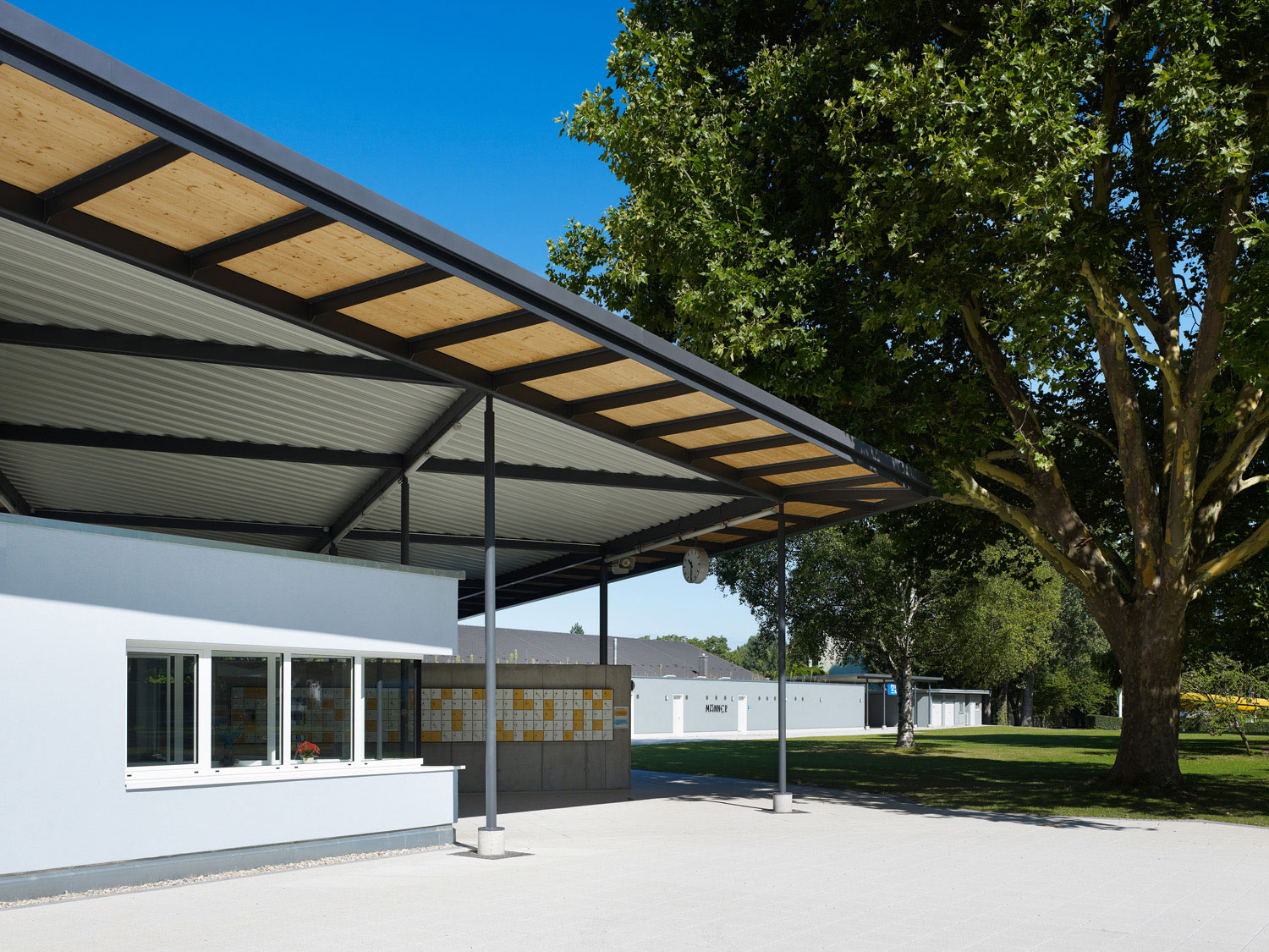 Die Hinführung zum Eingang wird durch zwei massive Schenkel, die mit leichtem Stahl-/Trapezblech verkleidet sind, klar markiert. Die Umkleiden befinden sich unter dem schwebenden Dach. In die massiven Schenkel kommen die nötigen Sanitärräume und die Kasse mit ihren Verwaltungsräumen unter.