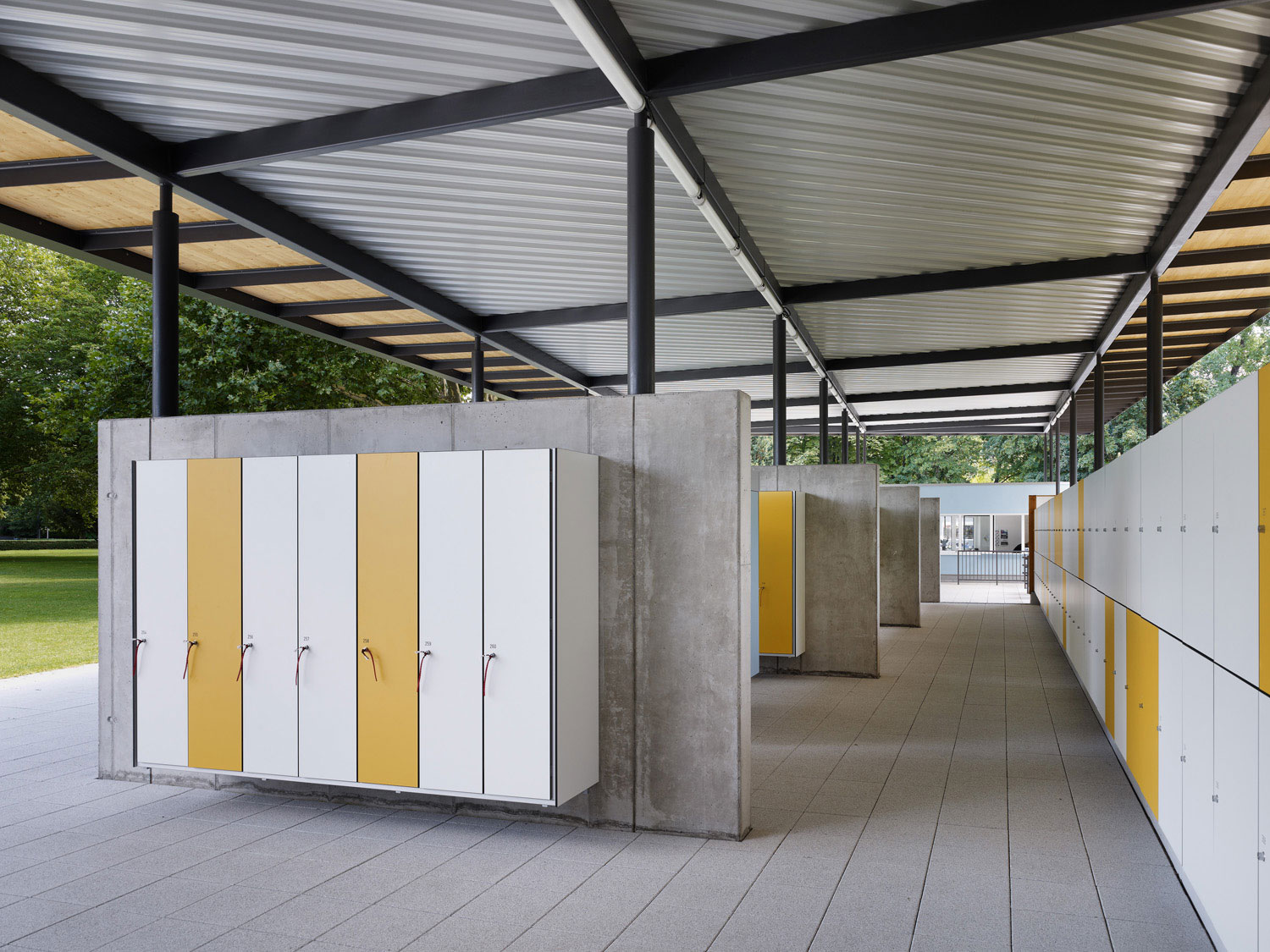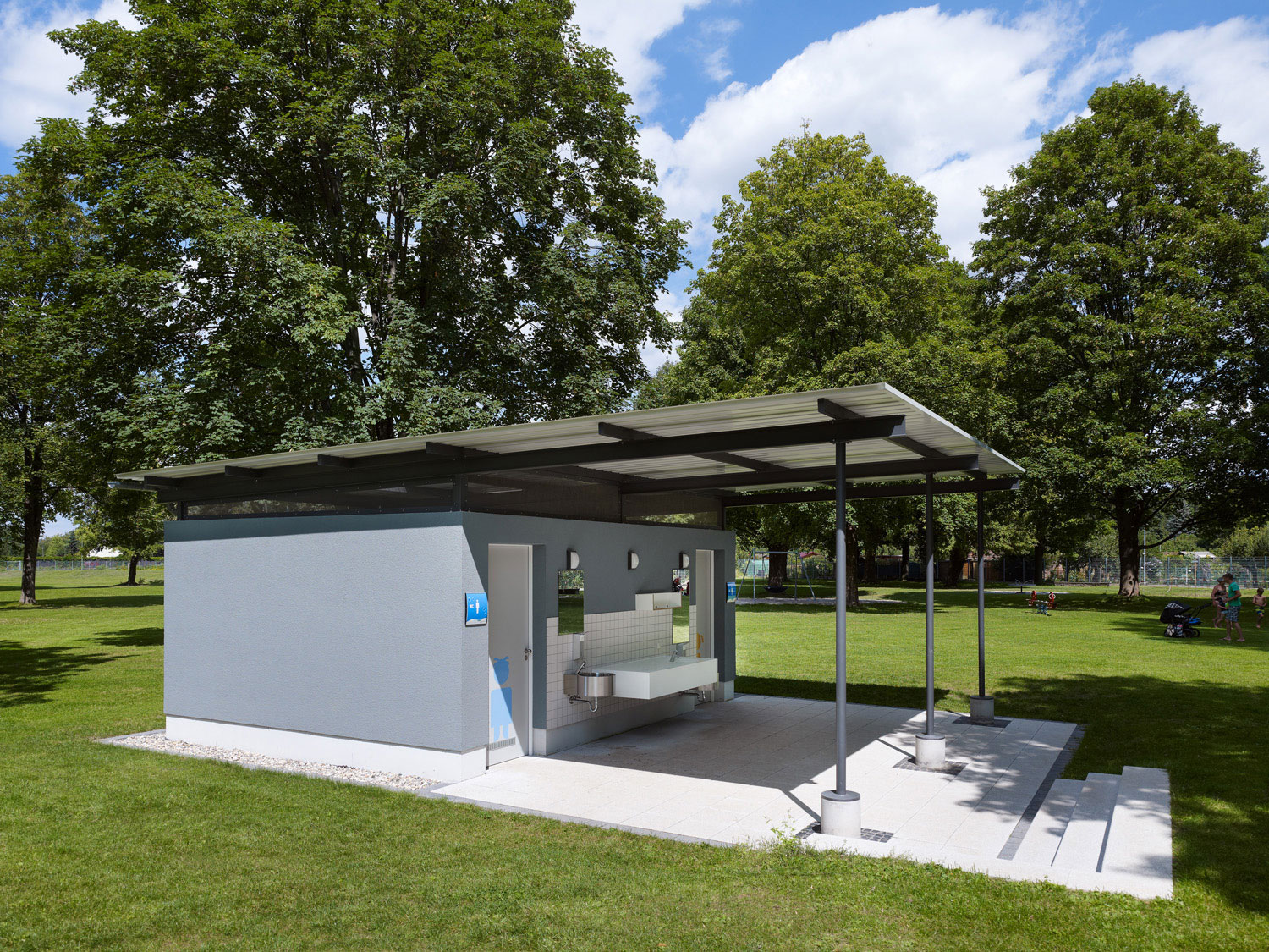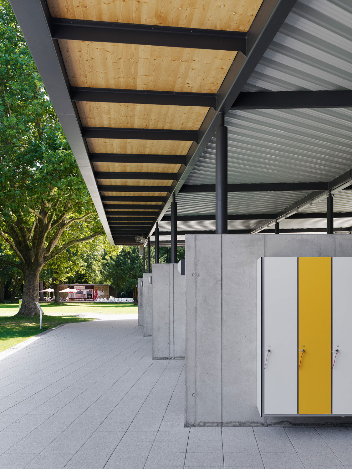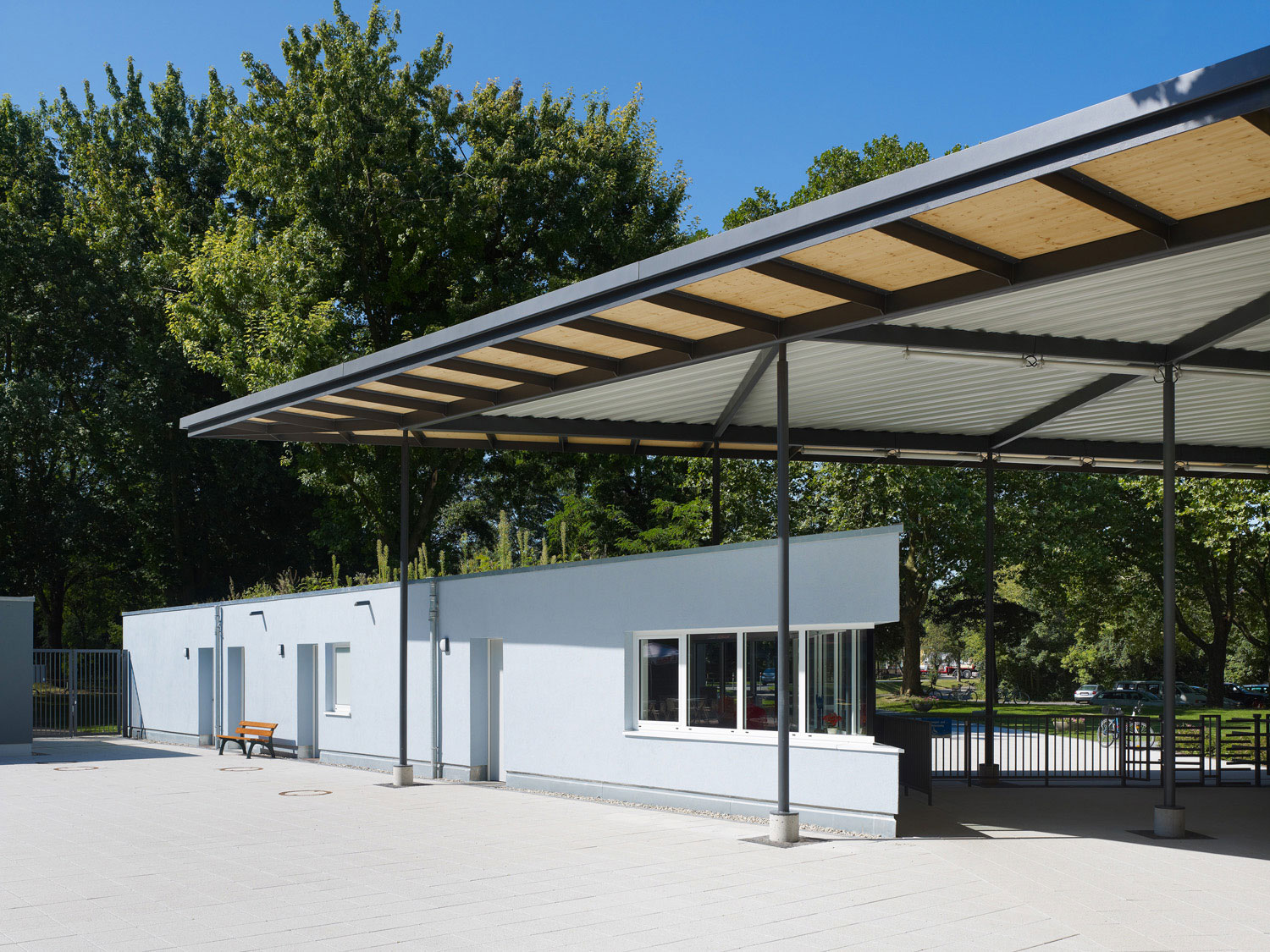 Ein durchgängiger Plattenbelag verbindet die Hochbauten mit dem Gastro-Container und der Milchbar. Auf dieser Terrasse kann sich die Gastronomie ausdehnen. Zum Teil überdeckt das Stahldach diese Fläche und funktioniert sowohl als Sonnenschutz als auch als Unterstand bei Platzregen.
