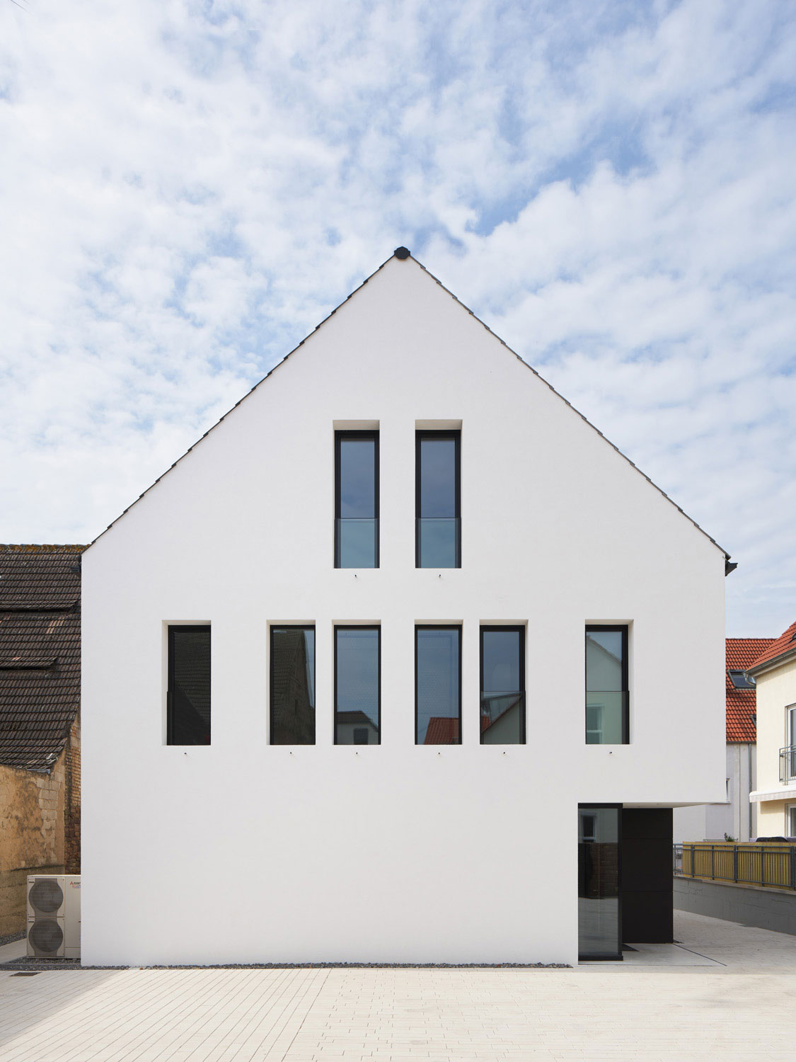 Es entstand ein Ensemble aus Vorderhaus mit Praxis und ein Hinterhaus mit Wohnen. Das Vorderhaus ist wie die alten Fachwerk-Bauernhäuser freistehend, das Hinterhaus ist Teil einer Reihe, der Scheunenreihe. Ortstypisch haben beide Gebäude steile Satteldächer, die jedoch modern, scharf geschnitten ausgeführt wurden. Materialität und Farben finden sich in beiden Häusern wieder, sodass die Zusammengehörigkeit unterstrichen wird.