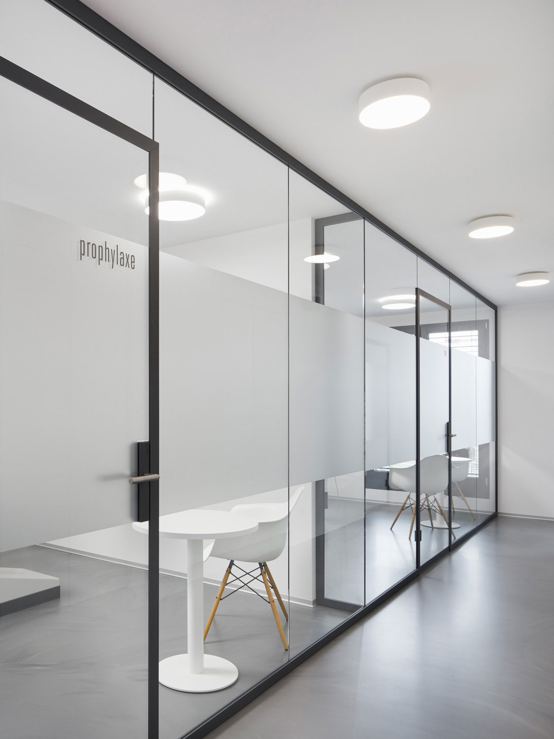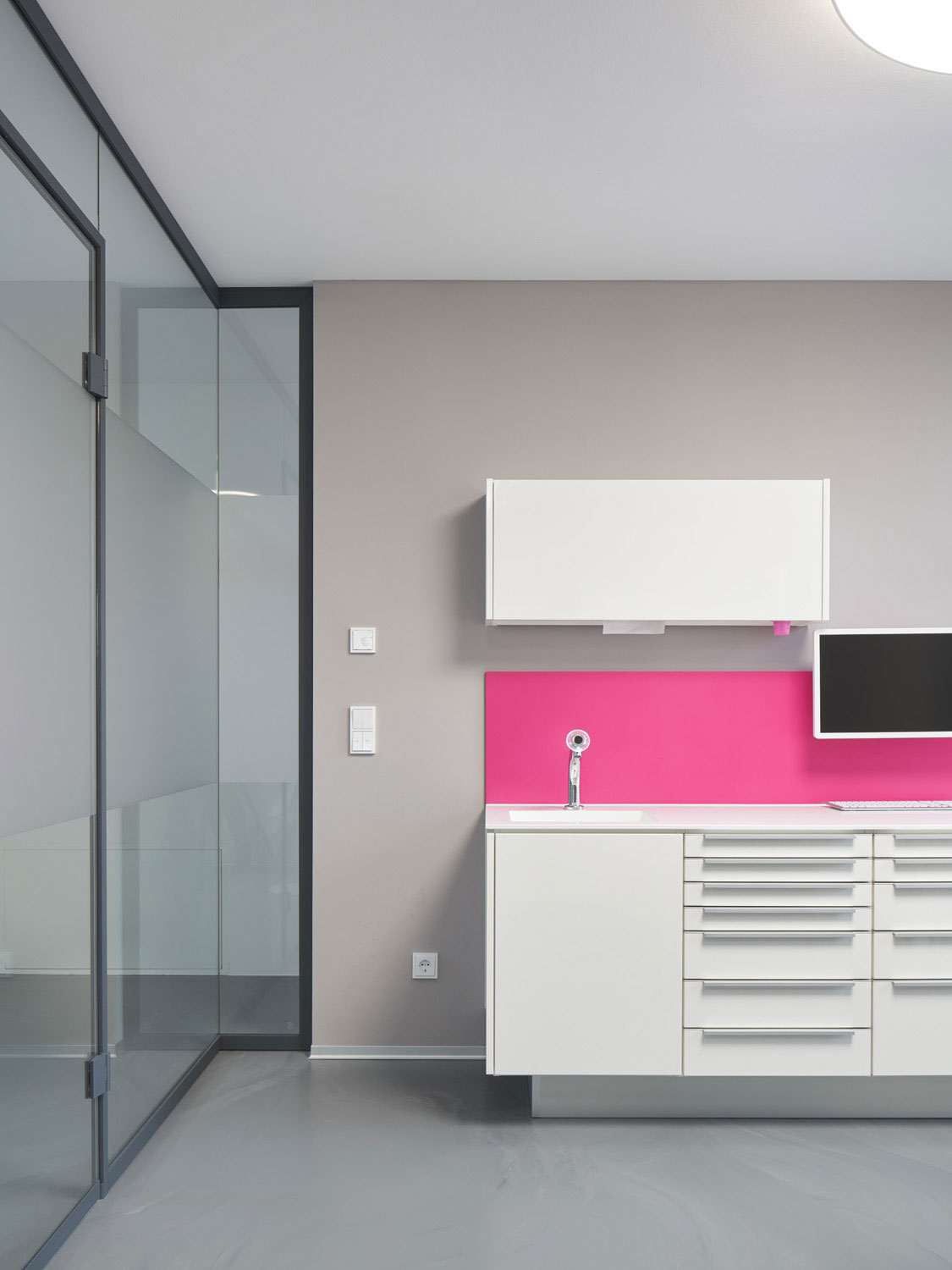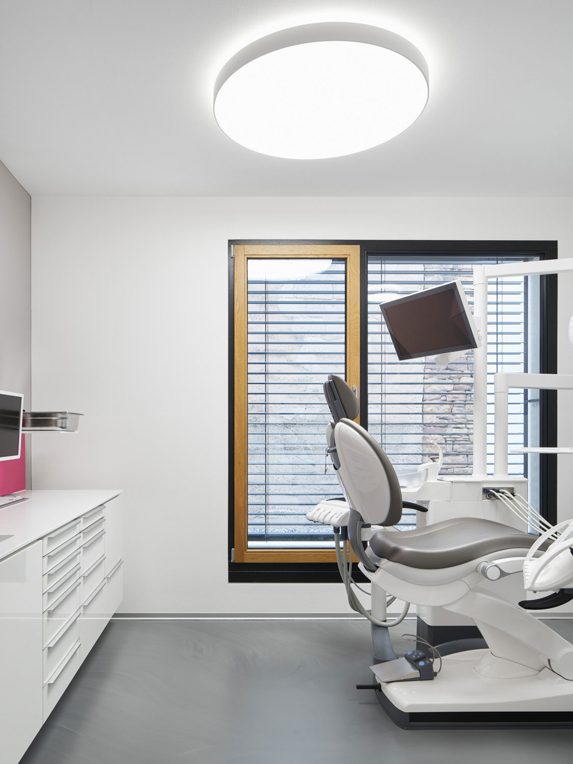 Das giebelständige Vorderhaus mit gereihten, stehenden Fensterformaten steht selbstbewusst zum Straßenraum. Die Volumensubtraktion am Gebäudeeck markiert den Eingang zur hochmodernen Praxis, die sich über alle Geschosse ausdehnt. Über den bestechend einfachen Treppenraum betritt man die Behandlungsräume. Diese wirken transparent, hell und dort durchlässig, wo es die Privatsphäre der Patienten nicht stört.