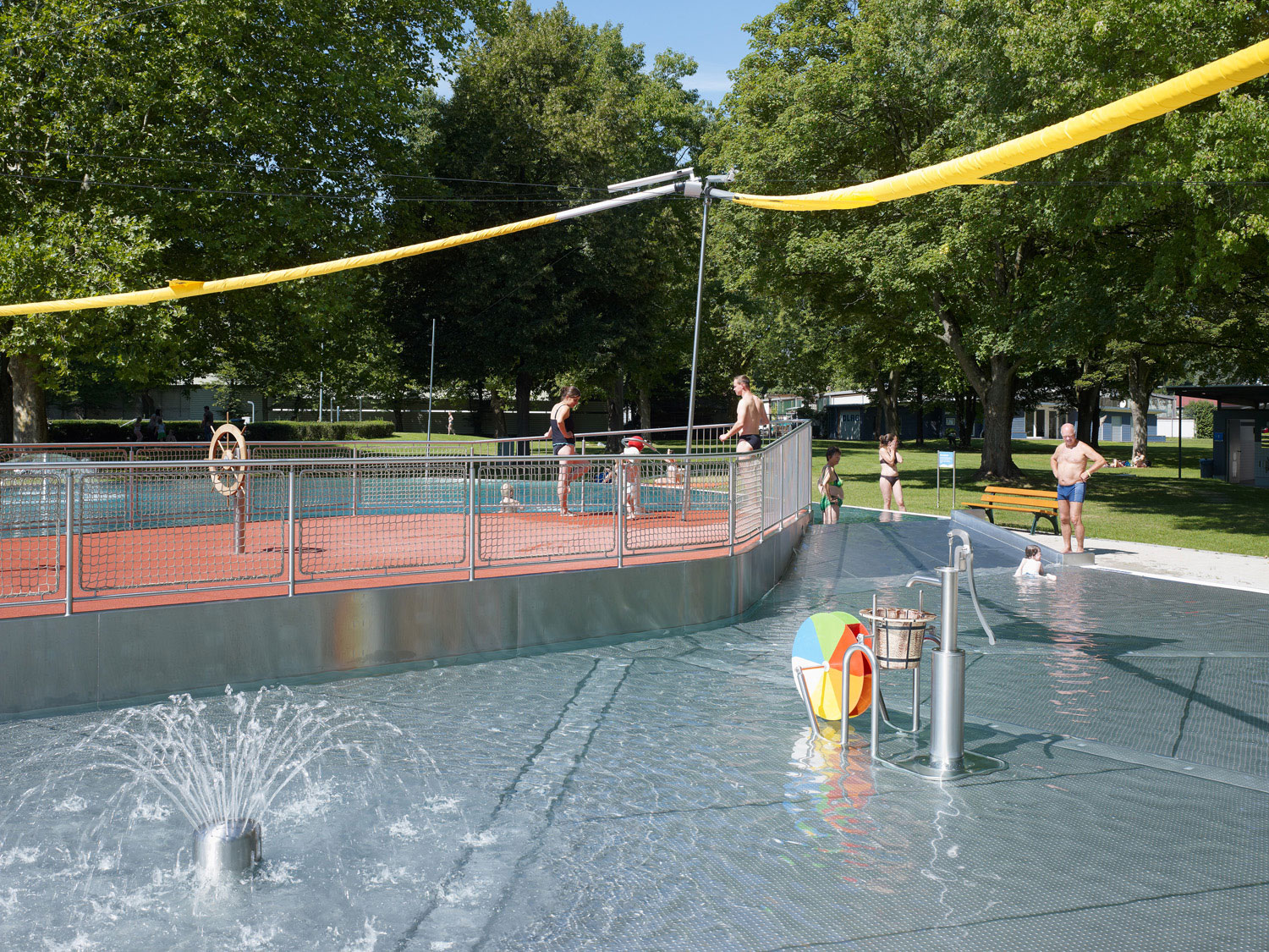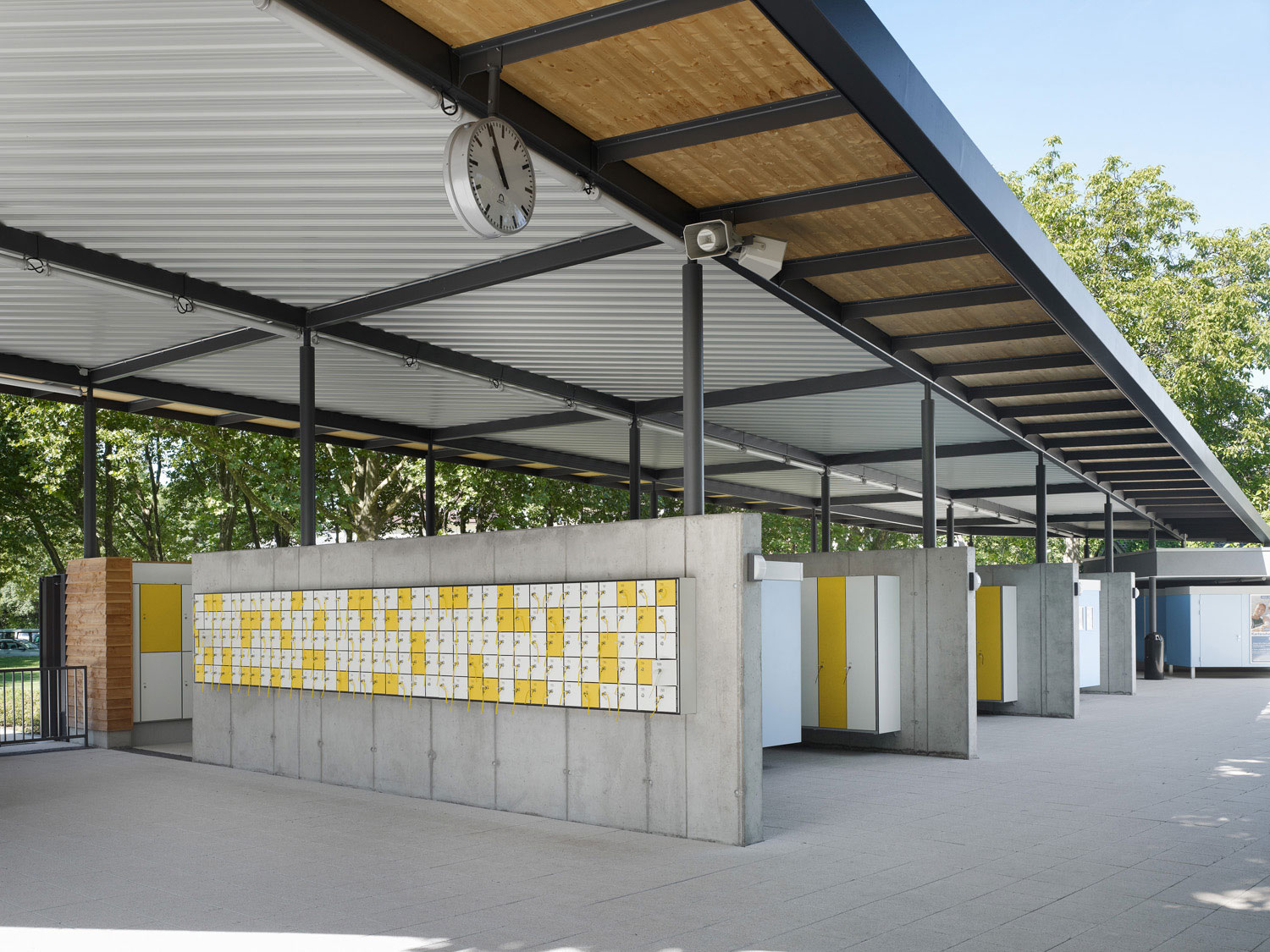 Ein durchgängiger Plattenbelag verbindet die Hochbauten mit dem Gastro-Container und der Milchbar. Auf dieser Terrasse kann sich die Gastronomie ausdehnen. Zum Teil überdeckt das Stahldach diese Fläche und funktioniert sowohl als Sonnenschutz als auch als Unterstand bei Platzregen.