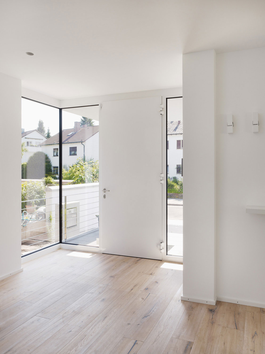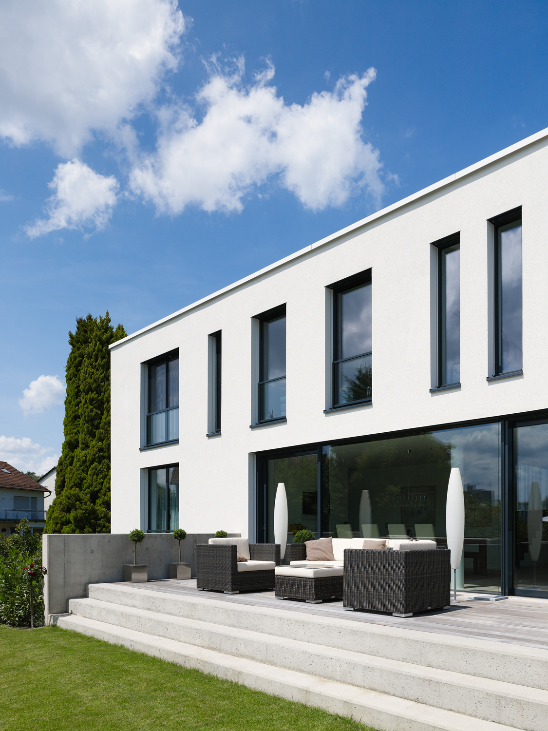 Im Erdgeschoss finden sich die Bereiche Kochen, Essen und Wohnen mit Bibliothek. Die Küche hat Kontakt zur Straße und zum Hauseingang. Der Koch-Essbereich öffnet sich großzügig zu der ausladenden Südterrasse. Über eine breite Stufenanlage kommt man in den Garten mit altem Nussbaum. Glücklicherweise konnte die dicht gewachsene Hecke und weitere groß gewachsene Pflanzen und Bäume erhalten werden, so dass der Garten mit geringem Aufwand kurz nach dem Einzug präsent war.