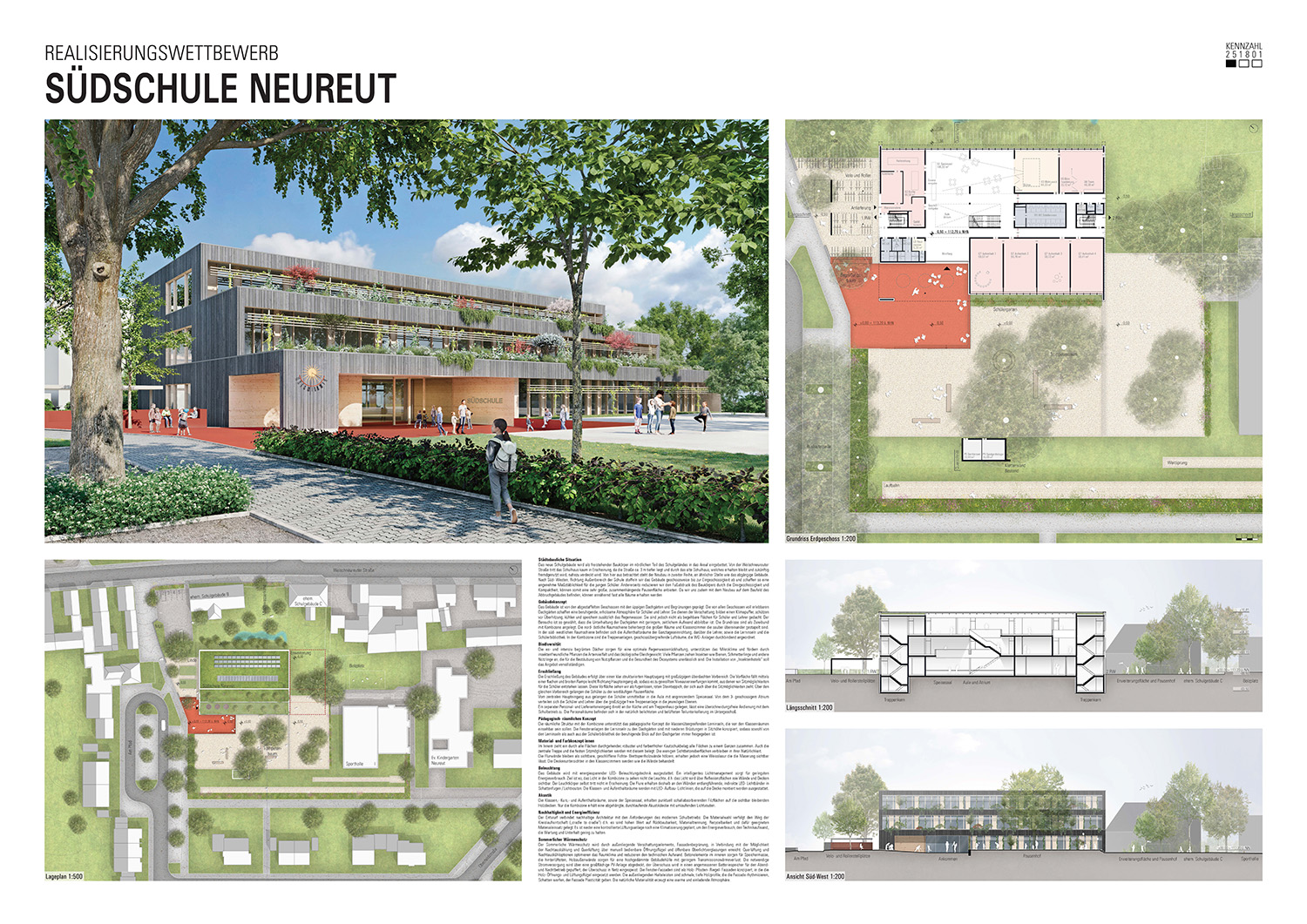 Nach verschiedenen Untersuchungen des bestehenden Schulkomplexes wurde entschieden, Bestandsgebäude der Südschule abzureißen und durch eine neue, den Anforderungen entsprechende Schulbebauung zu ersetzen. Gegenstand der Wettbewerbsaufgabe ist die Planung einer zweizügigen Grundschule als Ersatzbau auf dem Grundstück Flurstück Nr. 4396 in der Welschneureuter Straße in Neureut.