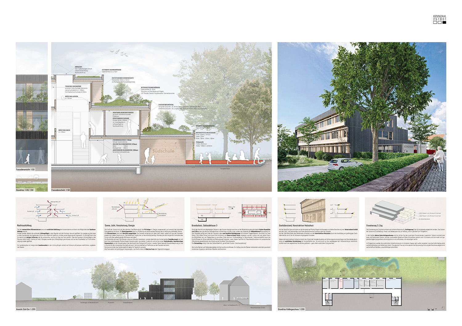 Der Entwurf verbindet nachhaltige Architektur mit den Anforderungen des modernen Schulbetriebs. Die Materialwahl verfolgt den Weg der Kreislaufwirtschaft („cradle to cradle“) d. h. es wird hohen Wert auf Rückbaubarkeit, Materialtrennung, Recycelbarkeit und dafür geeigneten Materialeinsatz gelegt. Es ist weder eine kontrollierte Lüftungsanlage noch eine Klimatisierung geplant, um den Energieverbrauch, den Technikaufwand, die Wartung und den Unterhalt gering zu halten.