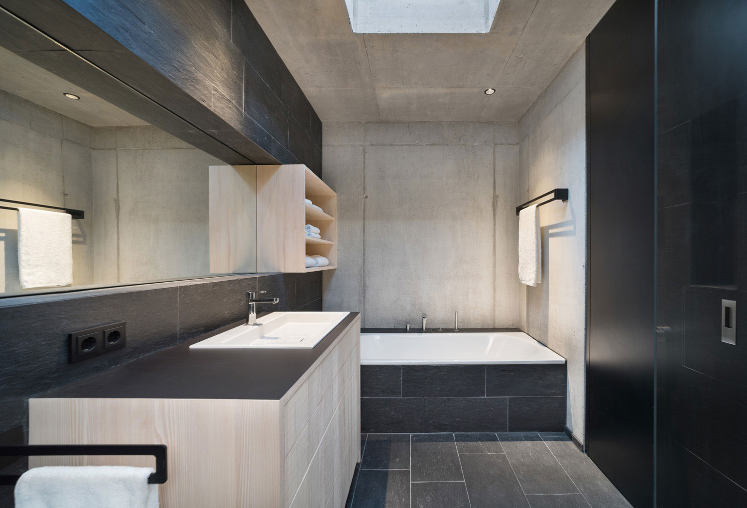 Im ganzen Haus ist ein roher Dielenboden ebenfalls aus Weißtanne verlegt, dieser zieht alle Bereiche zu einem Ganzen zusammen. Das Bad mit seinen Sichtbetonwänden und Naturschieferbekleidungen wirkt durch das zentral angeordnete Oberlicht wie eine wundersame Grotte.