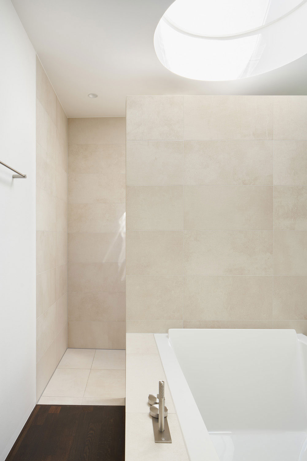 Im Innern sind die Räume von erfrischender Klarheit geprägt. Von jedem Standort eröffnen sich Durch- und Ausblicke, Sonnenlicht ist allgegenwärtig. Die Materialien nehmen sich freundlich zurück, ein dunkler Holzboden zieht alle Räume zu einem Großen zusammen. Perfekt ausgeführte Sichtbeton-Bauteile wirken vor den sonstigen weißen und schwarzen Putzflächen wie edle Natursteinwände. Die nicht sichtbar befestigten Treppenstufen zwischen den weißen Wänden vermitteln größtmögliche Transparenz. Stoffe als Sicht- und Verdunkelungsschutz in den Schlafräumen unterstützen diese Leichtigkeit.