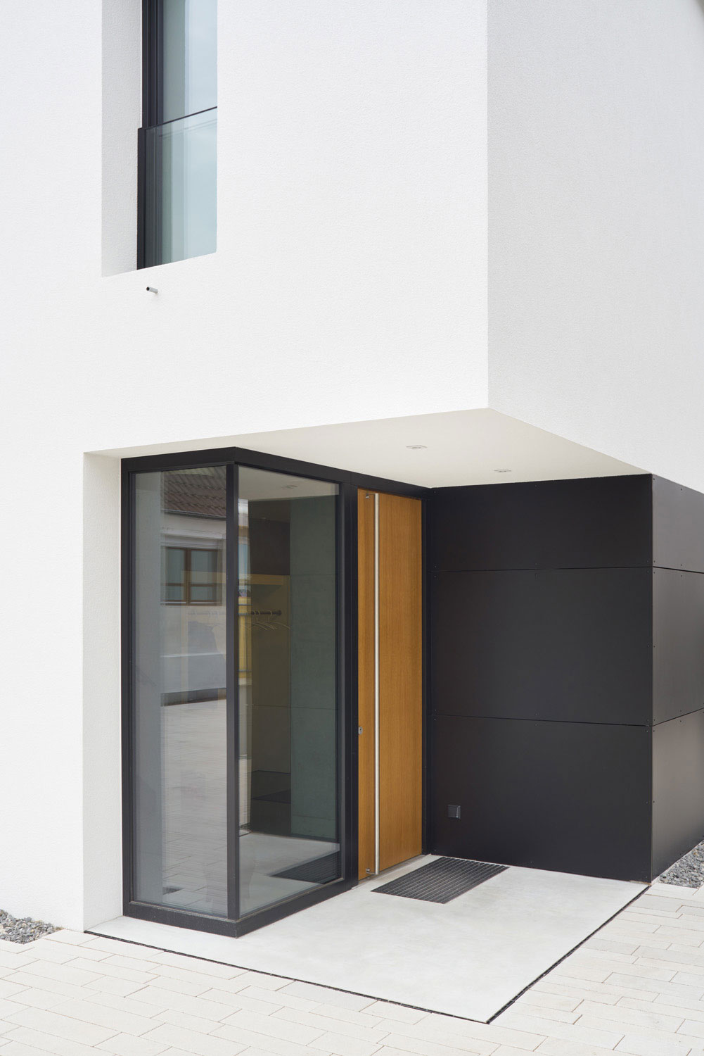 Es entstand ein Ensemble aus Vorderhaus mit Praxis und ein Hinterhaus mit Wohnen. Das Vorderhaus ist wie die alten Fachwerk-Bauernhäuser freistehend, das Hinterhaus ist Teil einer Reihe, der Scheunenreihe. Ortstypisch haben beide Gebäude steile Satteldächer, die jedoch modern, scharf geschnitten ausgeführt wurden. Materialität und Farben finden sich in beiden Häusern wieder, sodass die Zusammengehörigkeit unterstrichen wird.