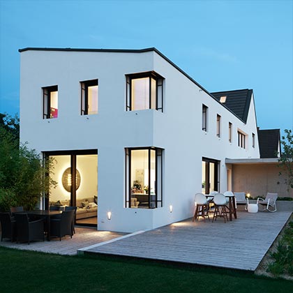 Beim Umbau der Doppelhaushälfte in Mannheim handelt es sich um einen Komplettumbau, da nur das Kellergeschoss stehenblieb. Um mehr Höhe im hinteren Bereich des Anbaus zu erzielen, wurde eine Lösung verschiedener Höhen, die sich inner- und außerhalb des Hauses widerspiegeln, realisiert.