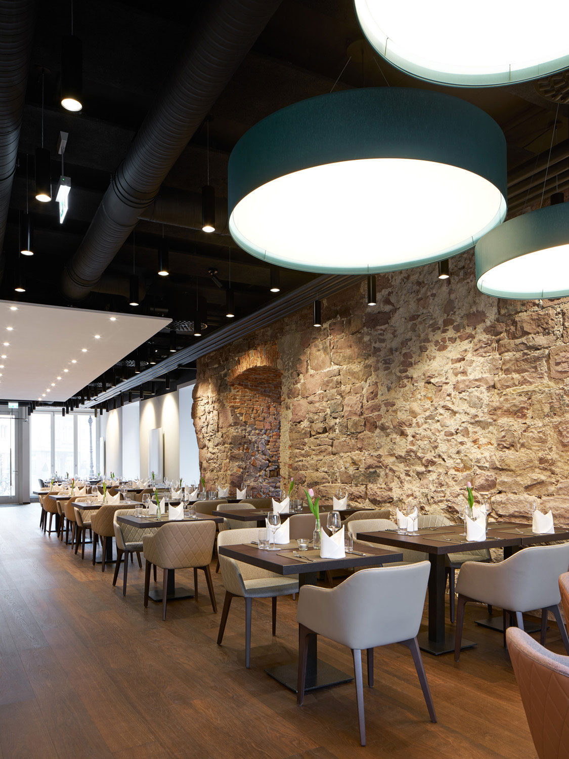 Das Restaurant öffnet sich heute mit großzügigen Fenstertüren zum Markplatz. Dort liegende Nebenräume wurden entfernt, der Gästebereich dadurch maximal vergrößert. Ebenso wurde der Blickkontakt zur „Alb“ ermöglicht, sodass der Gastraum heute komplett durchbindet.