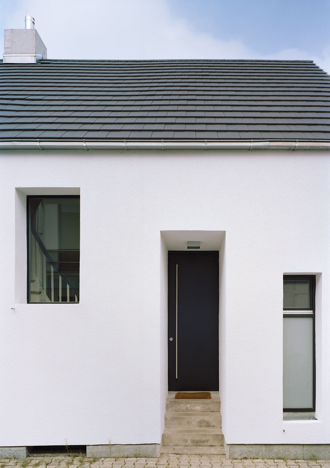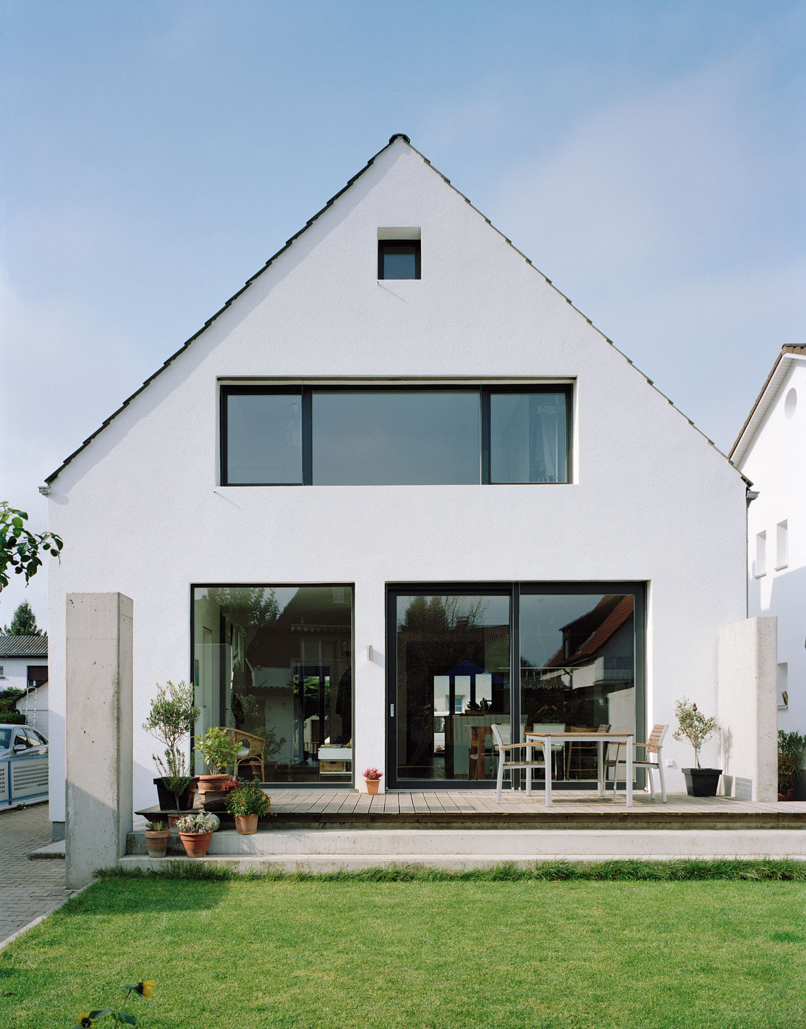 Bei diesem Projekt sollte ein kleines Siedlungshäuschen aus den 30er-Jahren mit einer Grundfläche von ca. 7,00 x 9,00 m für eine vierköpfige Familie umgebaut und erweitert werden. Zwei Möglicheiten der Erweiterung waren denkbar, eine Aufstockung oder eine Verlängerung des Hauses Richtung Garten.