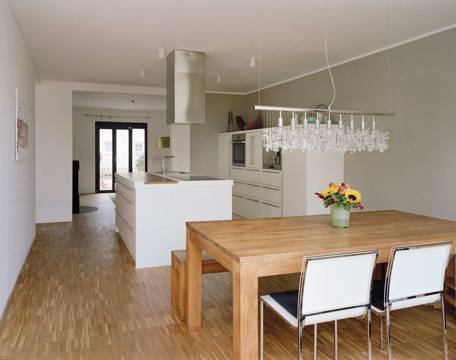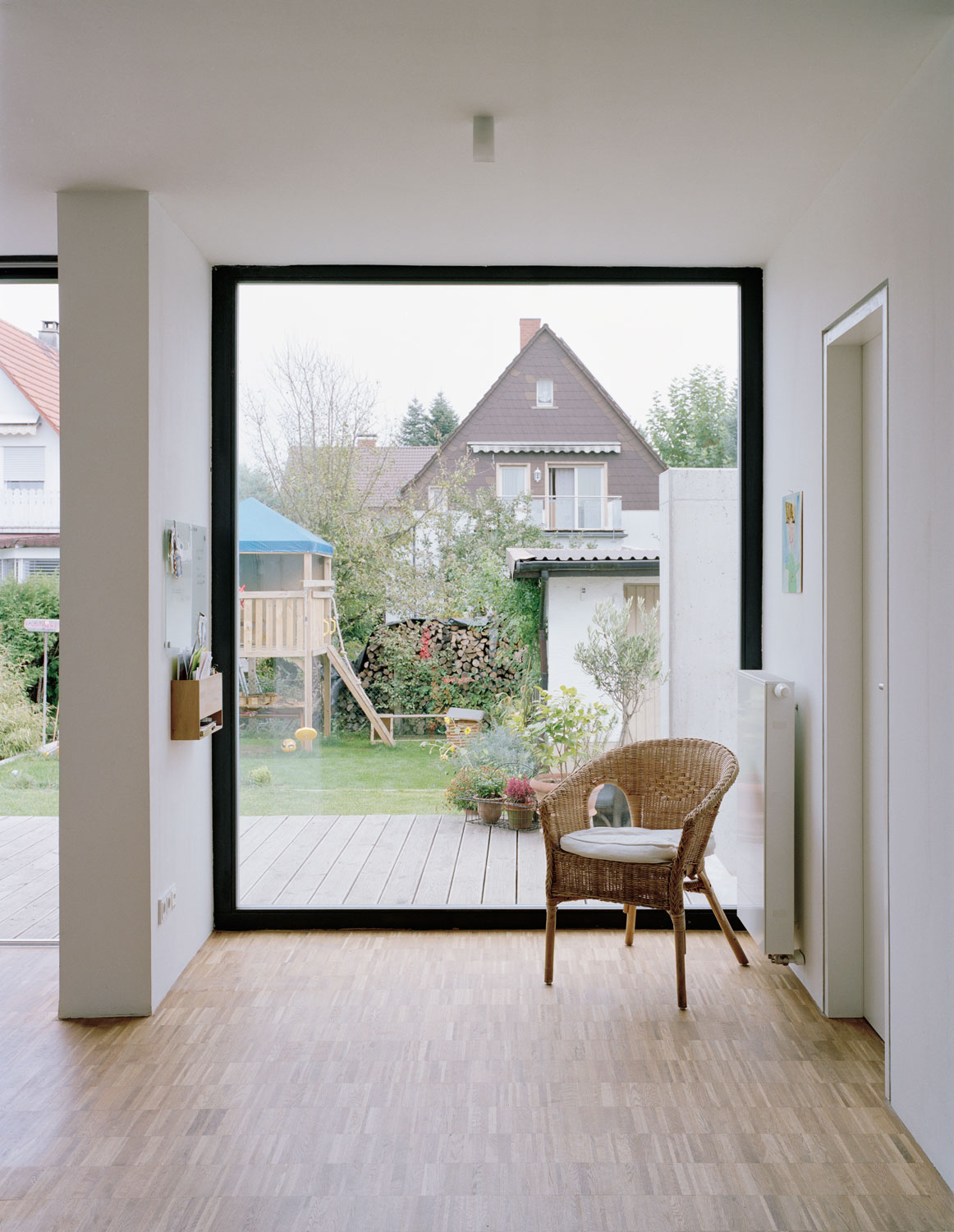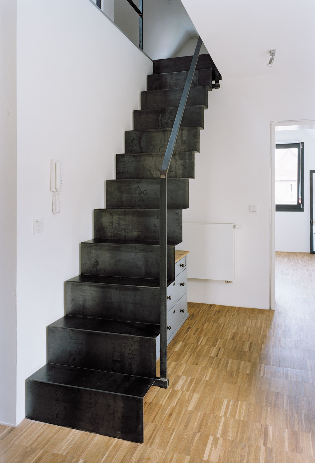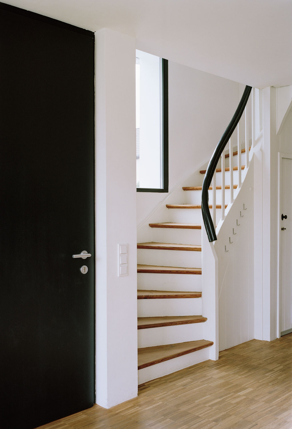 Beim Umbau mussten einige Innenwände weichen, um die Kleinteiligkeit aufzubrechen. Die Fenster zur Straße wurden bodentief, der Anbau zeitgemäß mit großen Fensterflächen zur Terrasse hin geöffnet. Die alte Holztreppe blieb erhalten, zur Bühne kam eine elegant gefaltete Stahltreppe hinzu. Das massive und sehr robuste Eiche-Industrieparkett wurde in allen Geschossen neu verlegt und zieht alle Flächen zusammen, der Grundriss fließt.